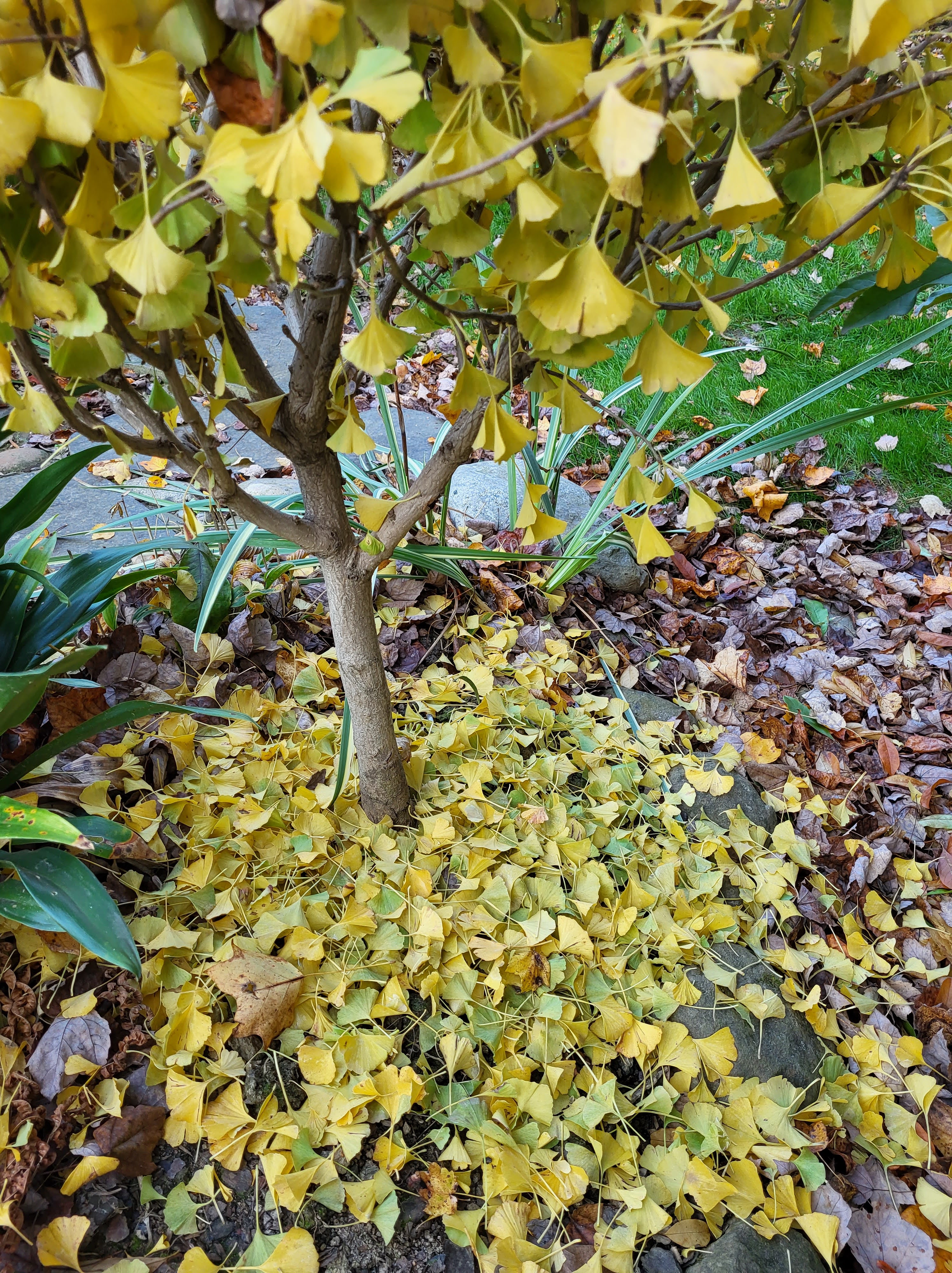 Leaves of the last of the ginkgoes carpet the ground.