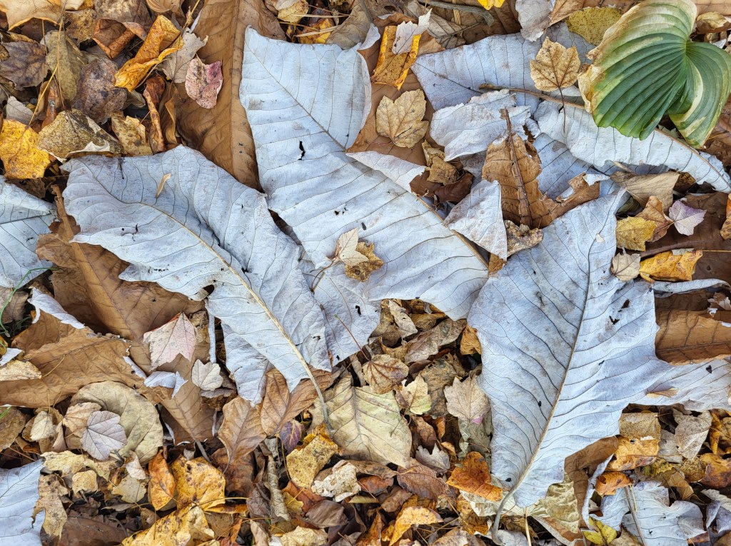 The side garden turns from dense shade to sunny almost overnight as the huge leaves of the bigleaf magnolia (Magnolia macrophylla, below) drop in early November. While some leaves that cover the garden’s paths are shredded, leaves of the magnolia clog the blower/ shredder, so the paths in the side garden are raked while leaves in most of the garden are left to decay through spring and summer.