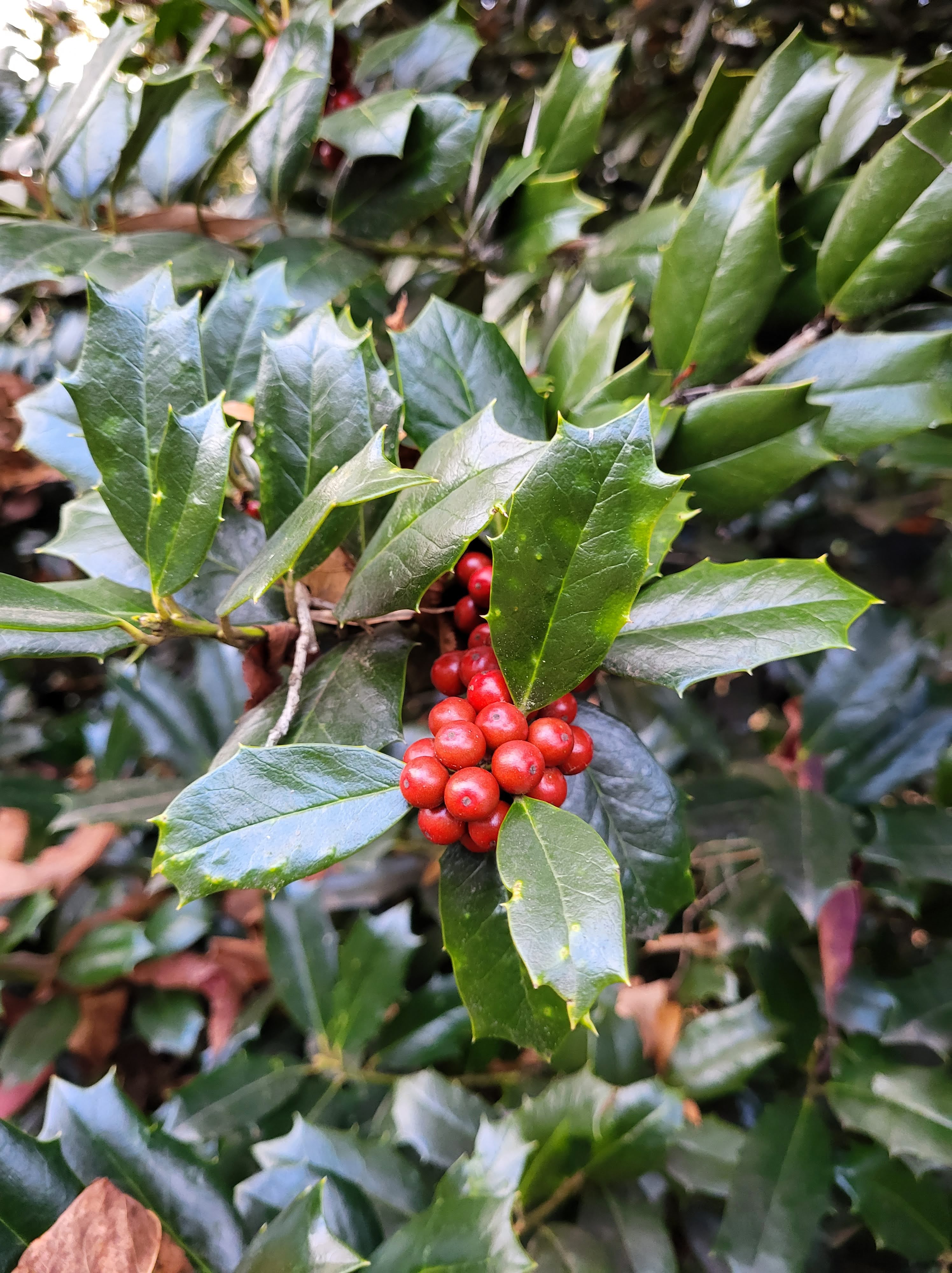 Unfortunately, lower branches were removed recently as the huge holly strayed too far over the driveway. The newly exposed trunk is attractive enough, but the lower branches were also ones where berries could be most readily viewed. Fortunately, there are other hollies nearby with plentiful berries, though I think the crop overall is less than typical. I blame bees, or at least the weather at the time when the hollies were flowering. Colder temperatures mean fewer bees, and fewer berries.