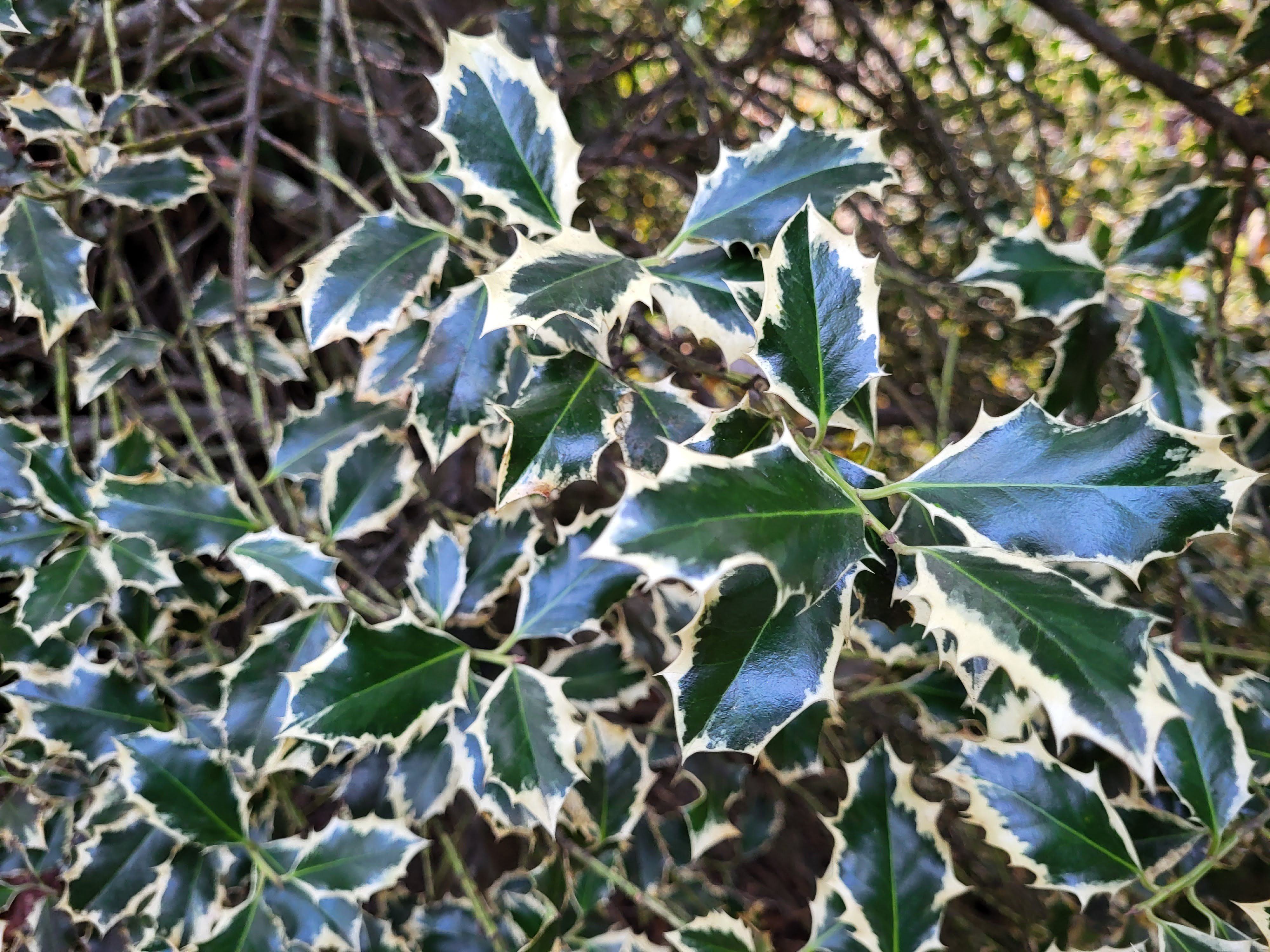 There are other hollies in the garden that stand out in autumn as trees drop their leaves, but none stand out like the variegated English holly (Ilex aquifolium ‘Argentea Marginata’, above) despite a lack of berries. I suppose this is a male holly, but it’s possible there are no pollinators around when it is flowering. It would be exceptional with red berries, but it’s a splendid holly without.