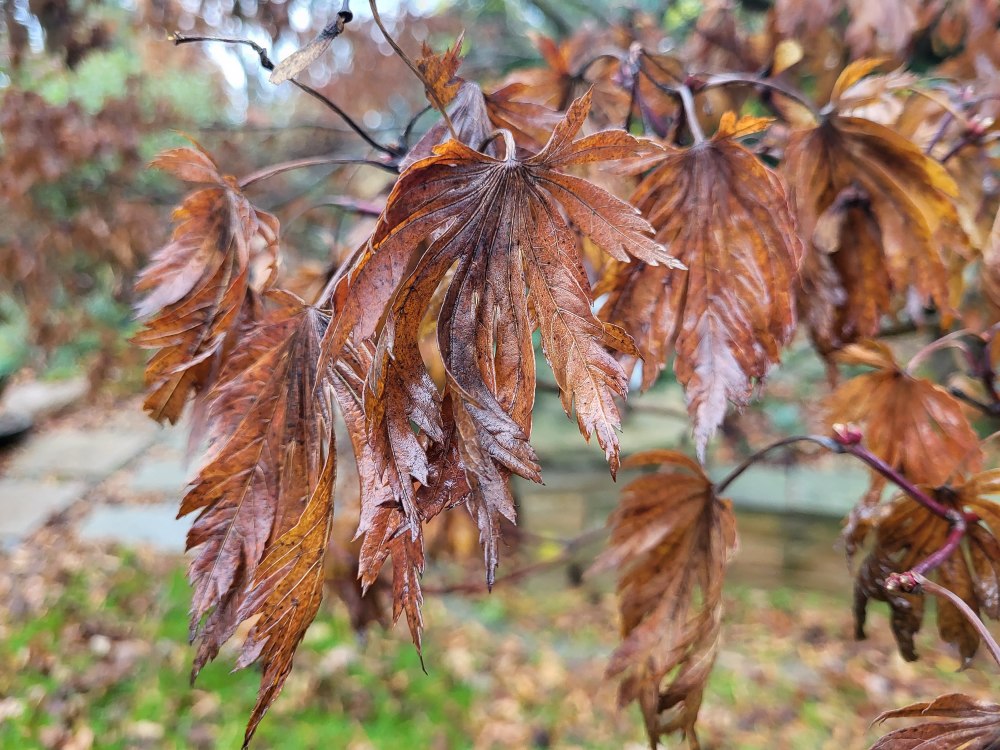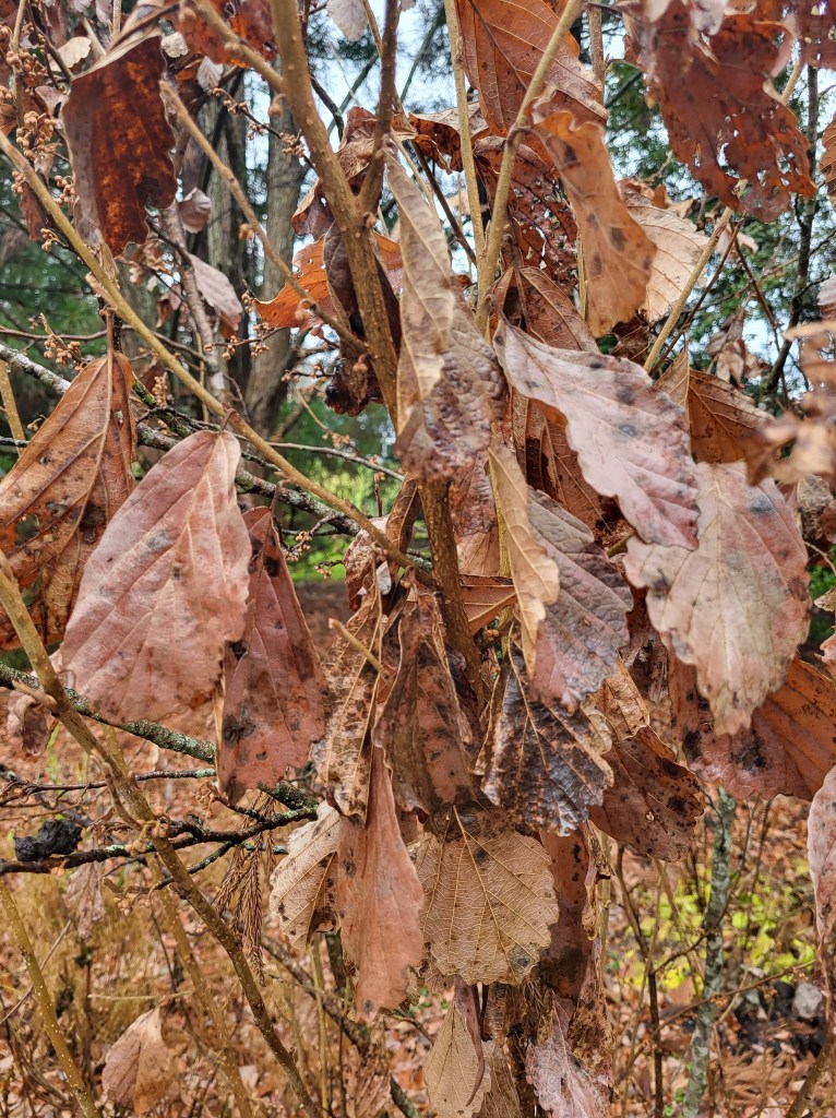 The marcescent leaves are common on oaks and beech, but also Japanese maple varieties that are typically late to turn to autumn colors while earlier coloring maples have long been bare. My guess is that this marcescence is more prevalent than is typical due to freezing temperatures that were also the season’s first frost. The sudden freeze interrupted the process of leaves coloring, then dropping.