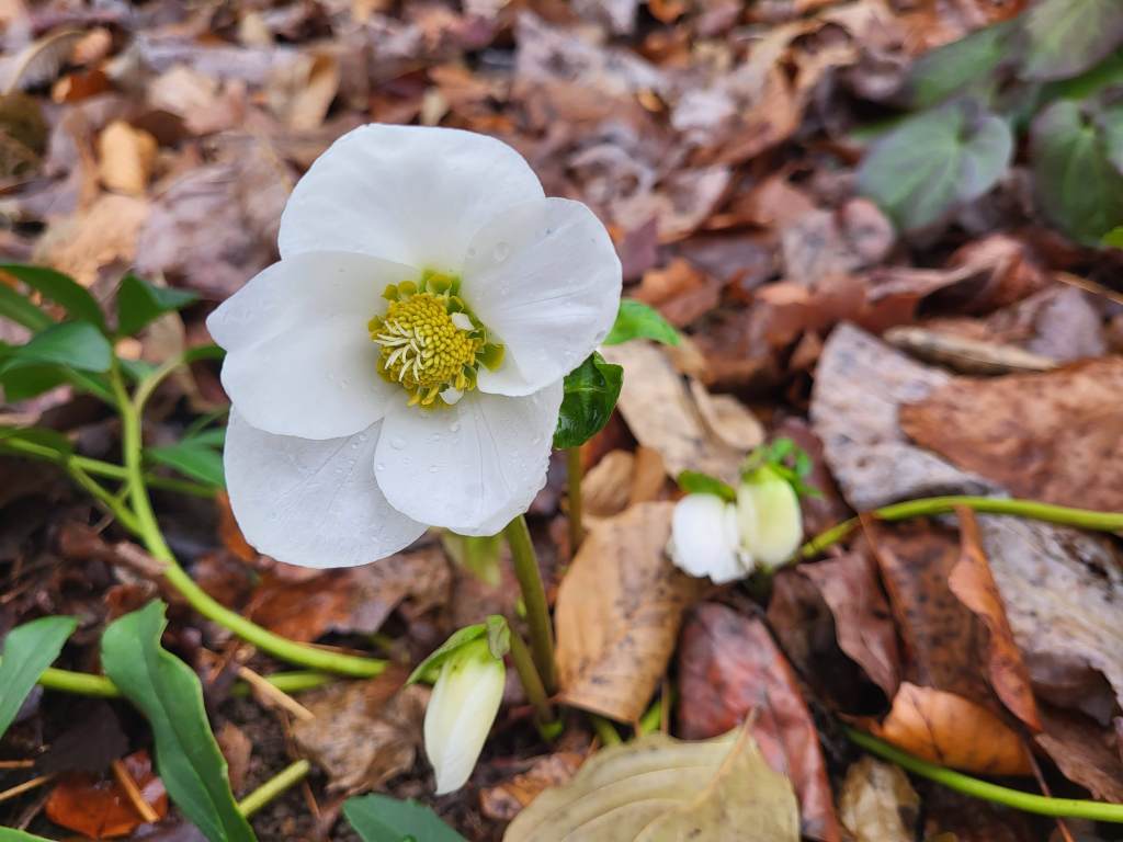 The earliest hellebores to flower are commonly called Christmas roses (Helleborus niger, above) with later blooming Lenten roses. I mention this, though I will never call hellebores a rose. The white, December flowering hellebores are less vigorous than most, though hybrids (below) that often flower beginning in early January in this garden are much sturdier and more vigorous.