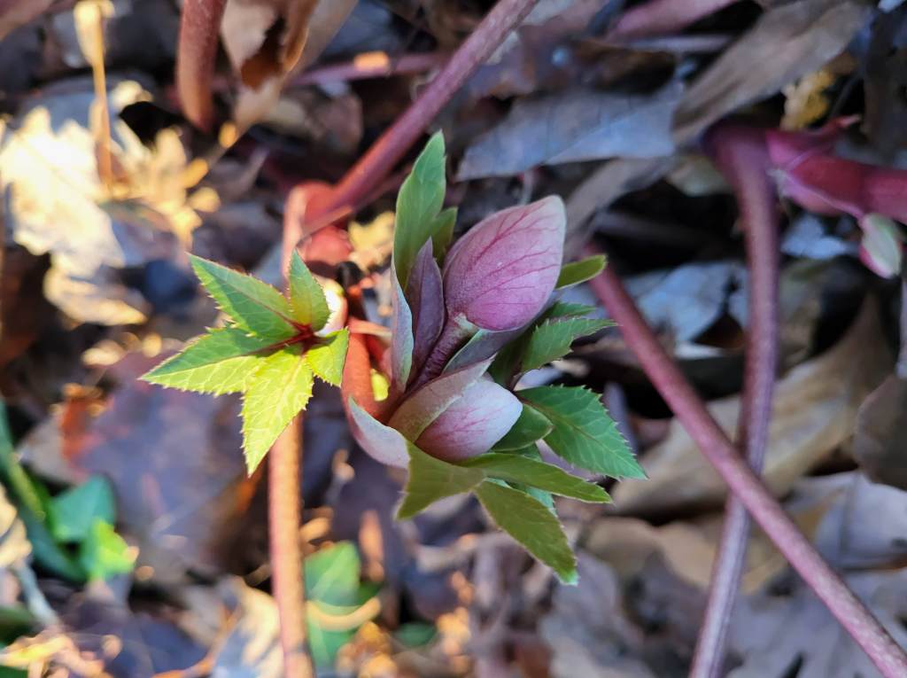 While flower buds of many hellebores will not be evident until late January, a number are showing colorful buds today. Every year, I think this is early, and while on occasion there will be additional flowers before the new year, most often the next flowers will delay until the second week of January or later.