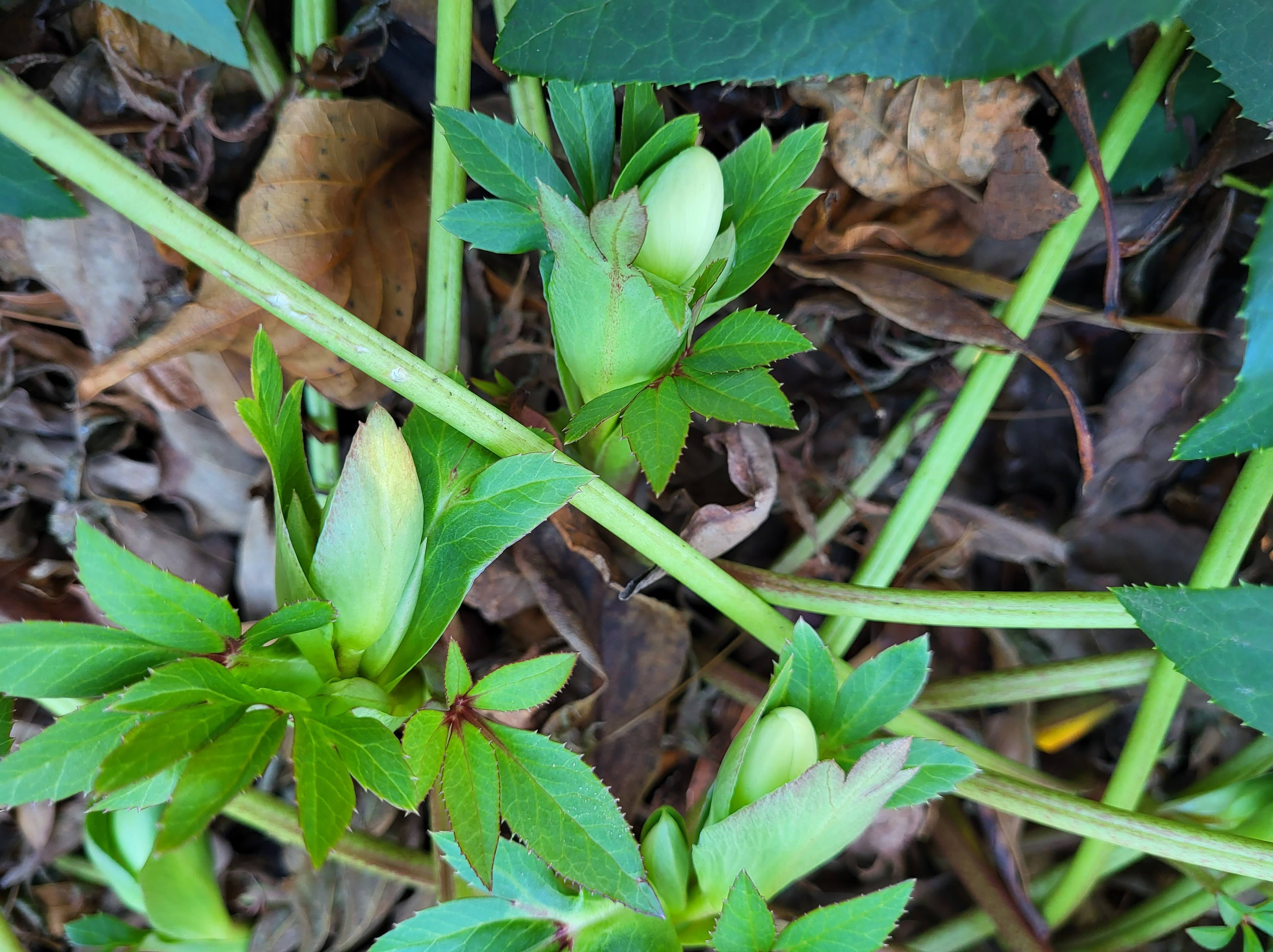 While flower buds of many hellebores will not be evident until late January, a number are showing colorful buds today. Every year, I think this is early, and while on occasion there will be additional flowers before the new year, most often the next flowers will delay until the second week of January or later.