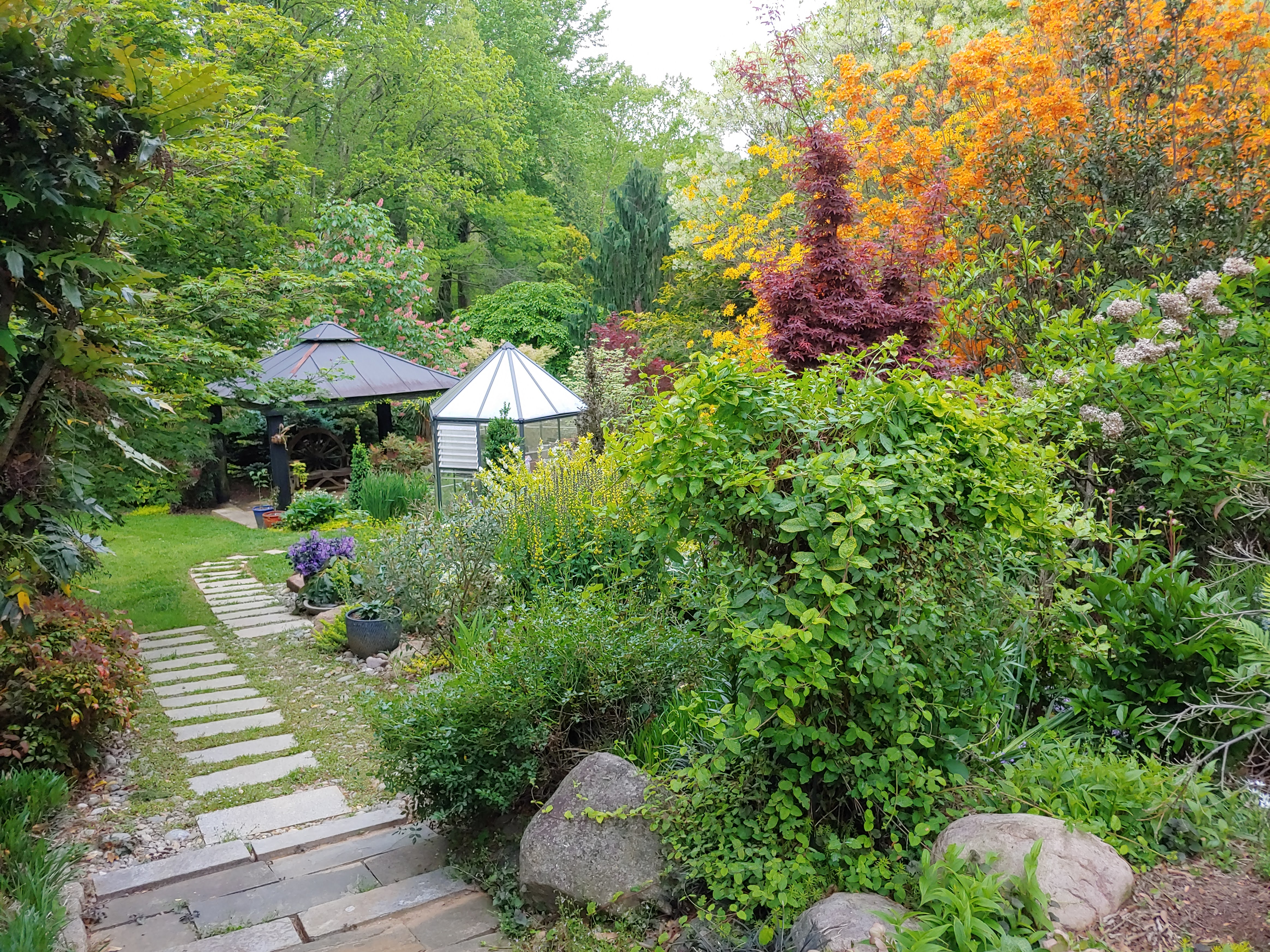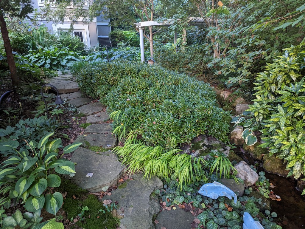 In any case, there is little more I can do. This garden is bordered by a native, undisturbed forest, and what was a farm meadow thirty-four years ago has become a dense forest of Japanese maples, redbuds, dogwoods, and dozens more trees. Here, natives and non-natives thrive side-by-side. Below is a layer of shrubs and a cover of lower growing ferns and perennials so that hardly an inch of bare earth remains. I’ve done my part, there’s little room for more, but certainly, this is a minor benefit to moderate the changing climate.