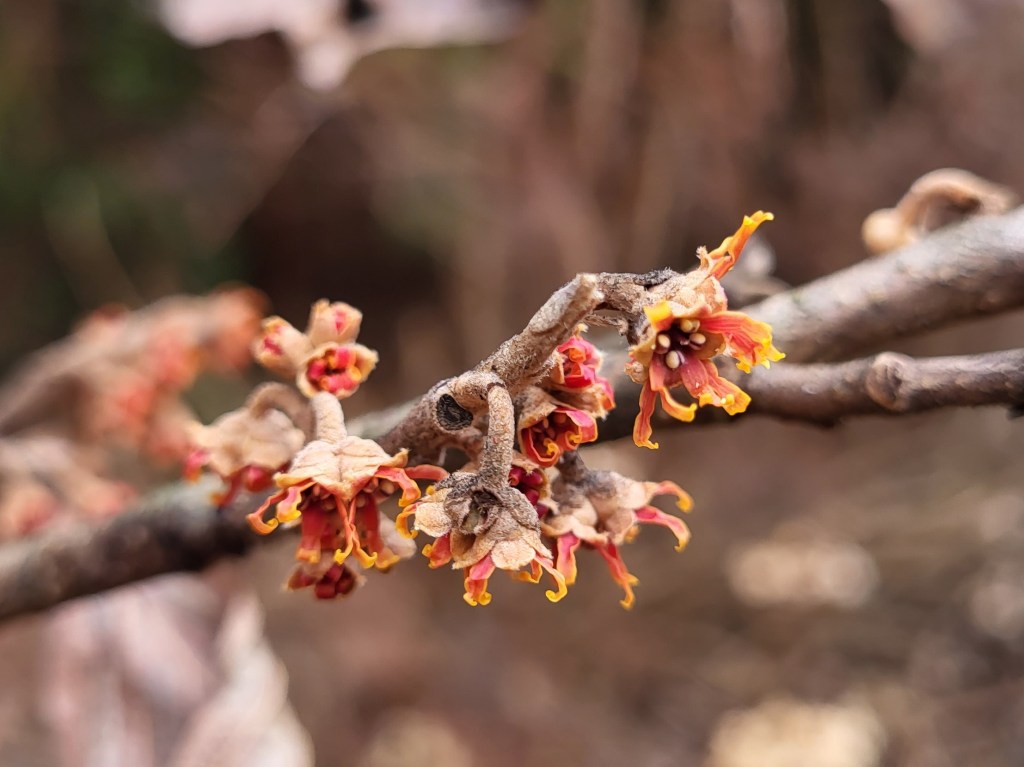The first spidery flowers of the vernal witch hazel (Hamamelis vernalis, above) opened the last week of December, though it will be a few weeks before its peak. On rare occasions, my generally oblivious nose recognizes the scent of various witch hazels wafting through the rear garden on mild winter afternoons. More often, I enjoy the progression of blooms from the muted yellow of the vernal witch hazel through brighter colored Asian hybrids that flower into March.
