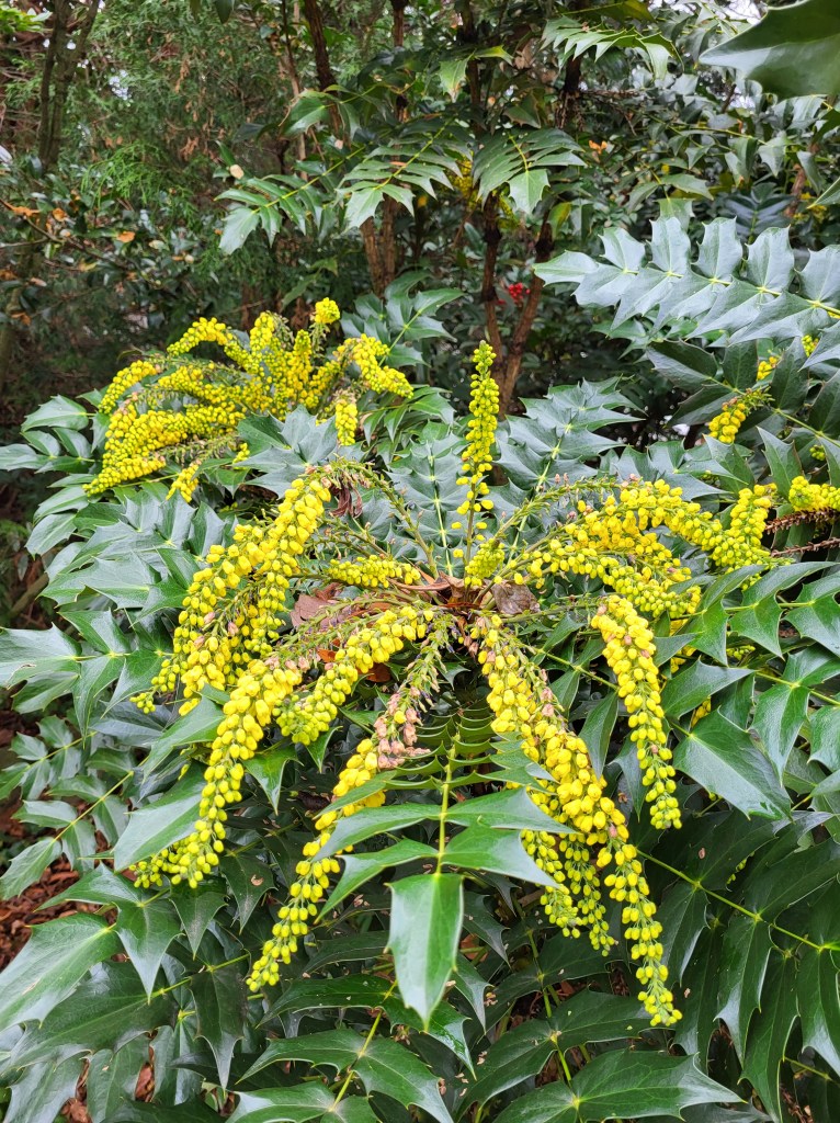 The most obvious flowers in January are the bright yellows of mahonias (Mahonia x media ‘Winter Sun’, below) scattered through the rear garden. Occasionally, the blooms fade before the new year, but today, I suspect flowers will persist several weeks longer. Rarely, the late winter flowers of leatherleaf mahonia (Mahonia bealei) intersect late in January, but typically, there is a several week gap.