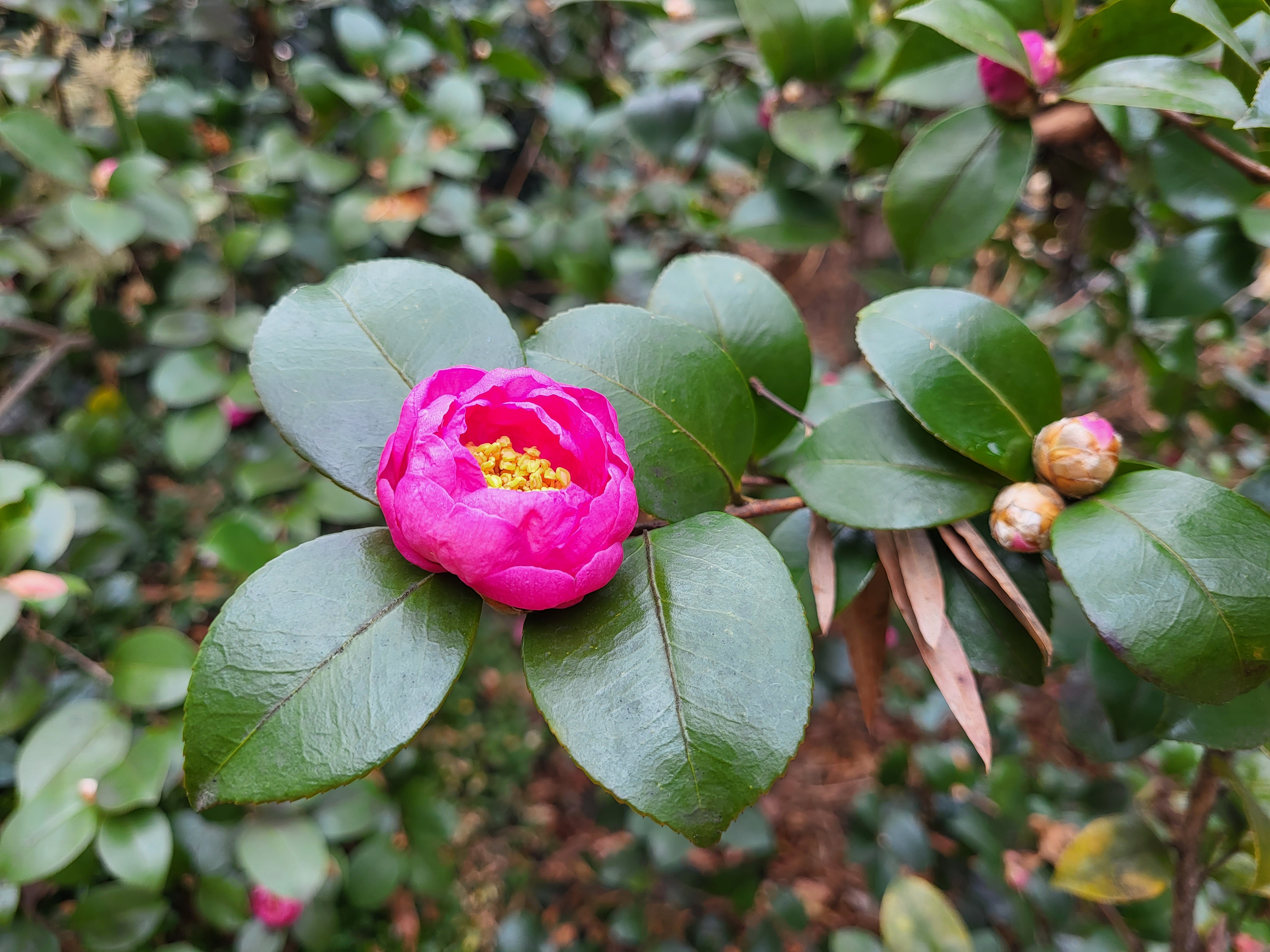 As always, two shaded camellias along the driveway delay flowering until January. Today, buds are swelling, but flowering in midwinter is typically short as nighttime temperatures ruin blooms shortly after buds open.