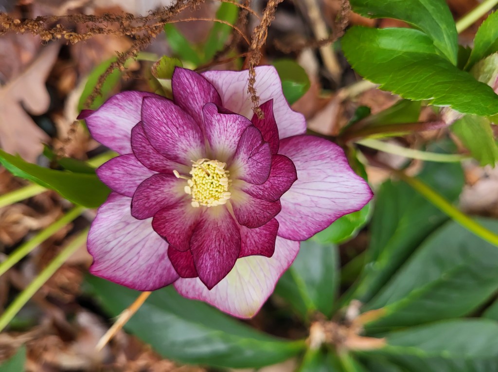 As the early flowering Christmas rose hellebores (Helleborus niger, above) fade by late January, the parade of blooms progresses to a peak in February. Surprisingly, a second double flowered hellebore is blooming (below) after another flowered earlier in December. Confused flowering spurred by less than obvious weather sequences is not unusual, but I have not seen this on hellebores in the past.