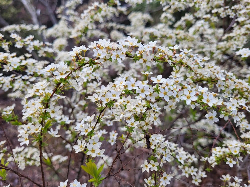 I am not surprised to see a few flowers on the yellow, threadleafed ‘Ogon’ spirea (Spirea thunbergii ‘Ogon’, below) this second week of January. Temperatures have been very average, not particularly mild, but it’s not unusual to see a few scattered white blooms later in winter. This is a week or two early, and the small numbers of flowers through the winter do not seem to detract from the spirea’s peak flowering in mid-March. Today, any bloom is welcomed, so ‘Ogon’ will be added to the daily tour of the garden.