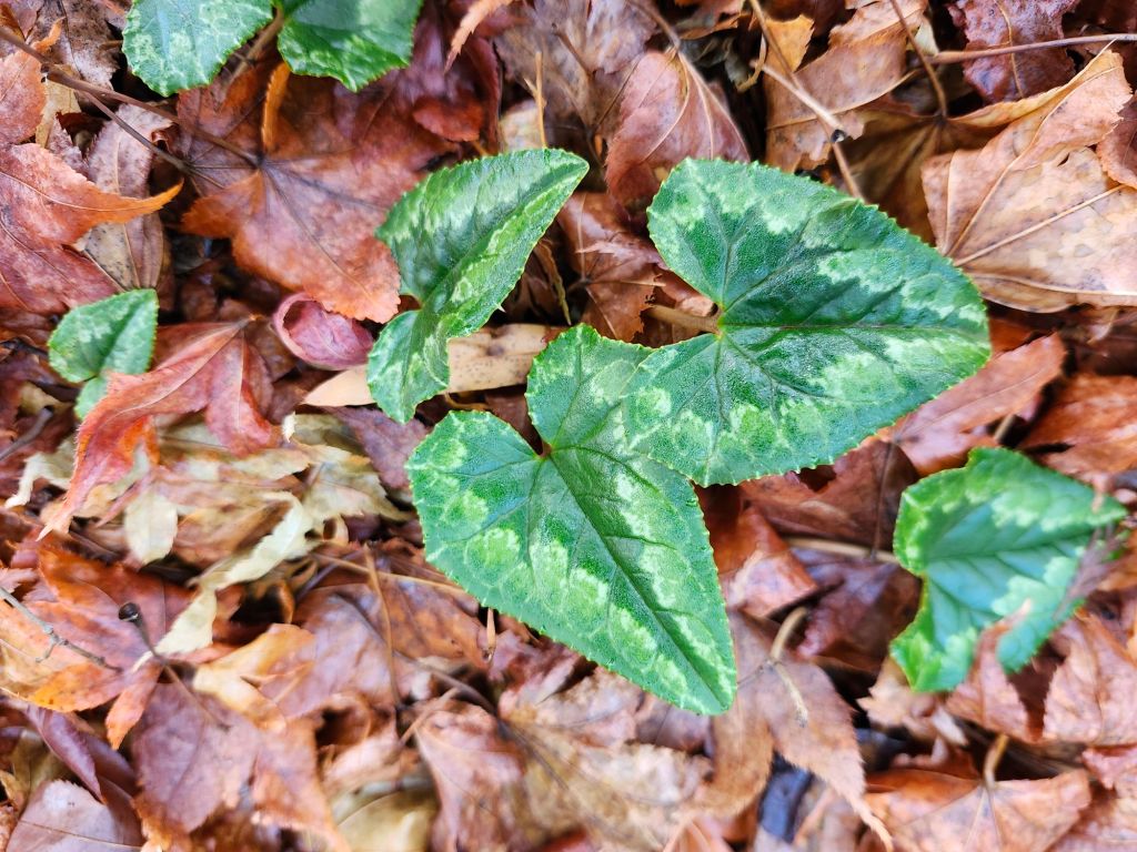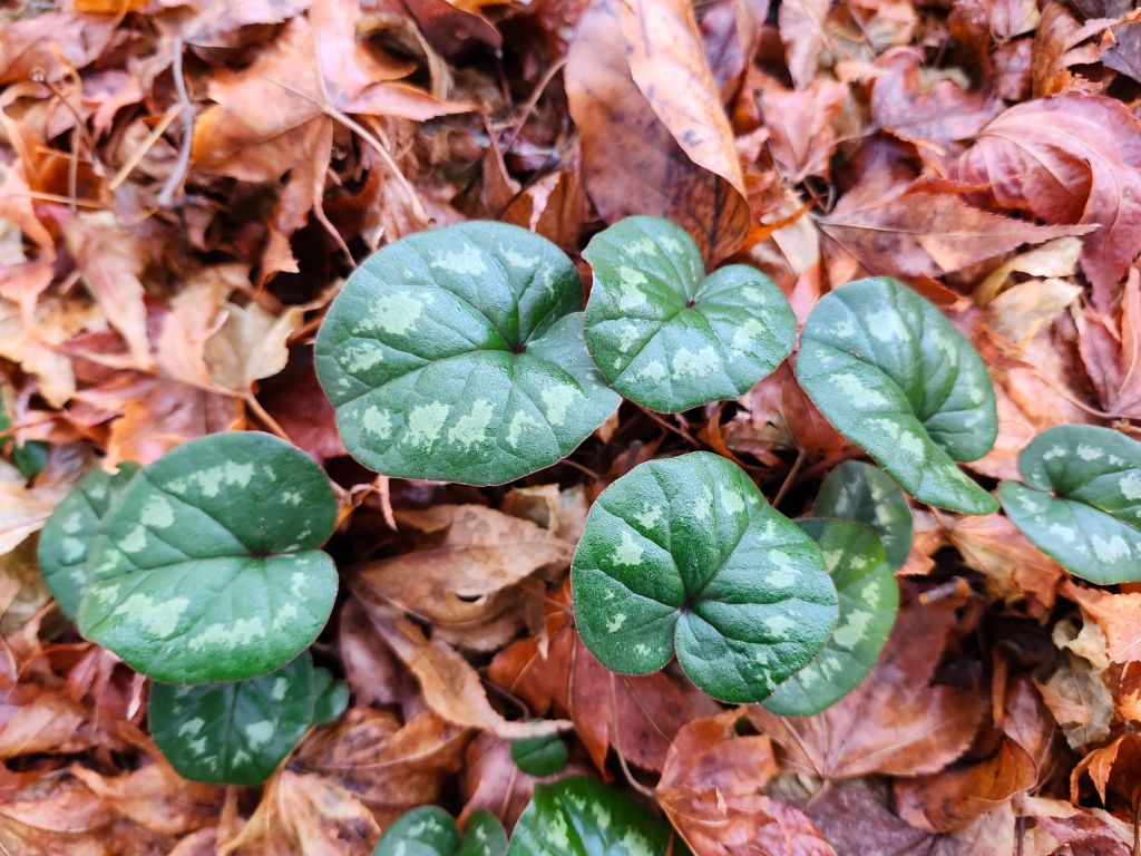 Not only flowers catch my attention as I stroll the garden. I notice that varieties of Cyclamen (below) have doubled their spread. Again, I accept blame for not paying attention to species or culivar names, but how can you go wrong? If you’re in the garden in January, these are a must.