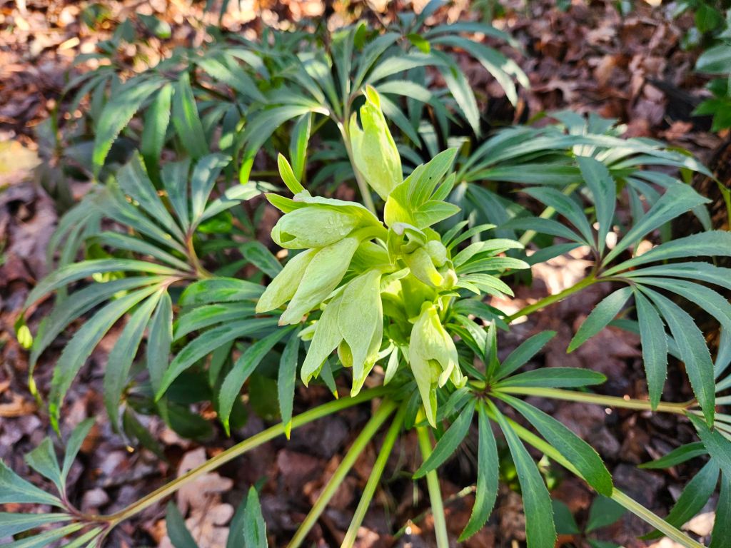 The leaves of hellebores, recommended for removal by most, are undamaged by the few nights that have dipped into the upper teens (Fahrenheit). I prefer to keep the evergreen leaves unless they become unsightly, usually a result of temperaures nearing zero. Flowers of several long-established hellebores nestle down into the foliage, so I will often carefully chop these as buds begin to open.