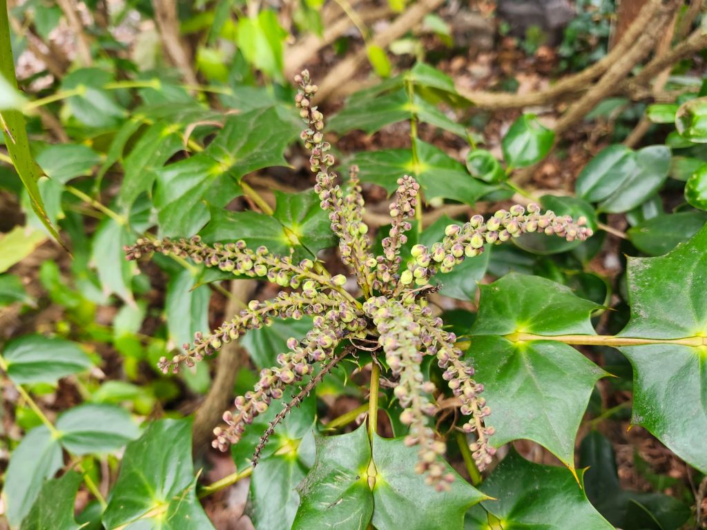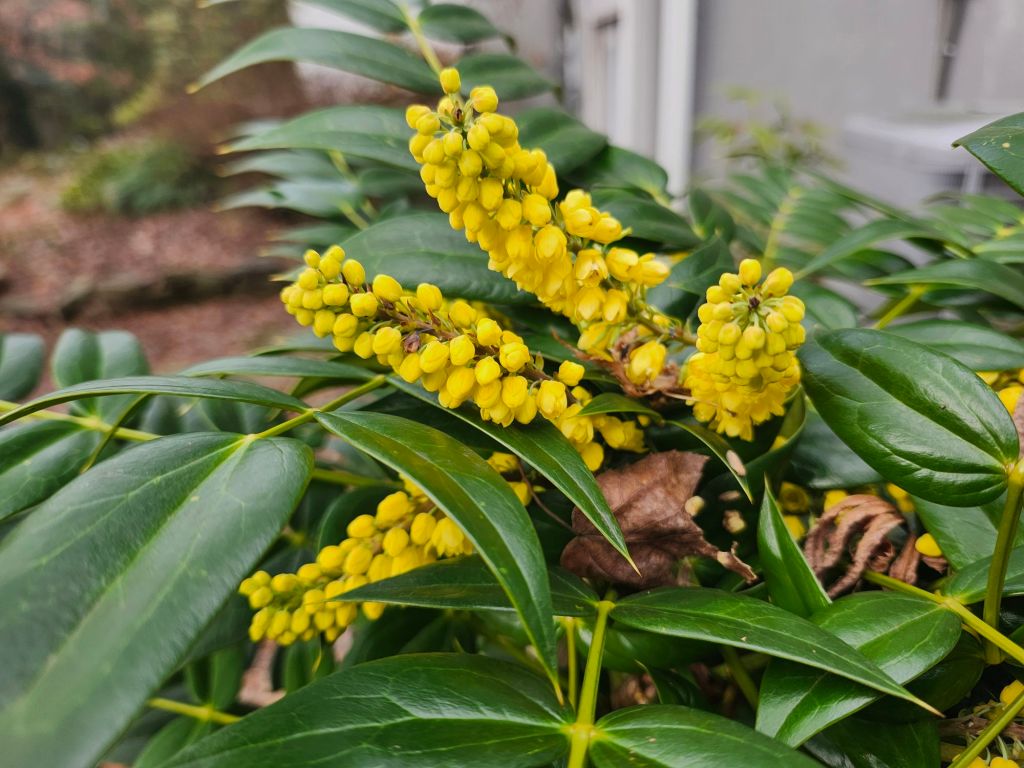 Mahonias (Mahonia x media ‘Marvel’, above) that began their cheery flowering in late autumn continue into mid-January. I see the first crack of color on late winter flowering leatherleaf mahonias (Mahonia bealei, below). If ‘Marvel’ and ‘Winter Sun’ hang on a while longer, the autumn and late winter blooms could intersect. Not unheard of, but rare in this garden.