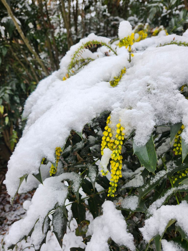 Of course, this damage is not unexpected, and by the slim chance that any flowers had been pollinated, there will be no berries. While occasional seedlings are found orienting from the late winter flowering leatherleaf mahonias (M. bealei or B. bealei), none have been discovered from the autumn into early winter flowering hybrids. The scarcity of active bees November into January in our area is a ready explanation.
