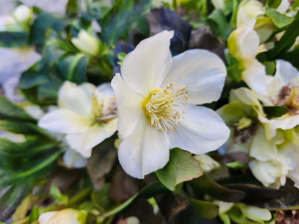 Flowers of hellebores are temporarily buried beneath inches of snow, though milder temperatures and the possibility of rain in the coming week could bring them back into view. Flowers of vernal witch hazels (Hamamelis vernalis, below) have been tightly bundled for protection through this period of cold, but the spidery blooms should unfurl by early in the week (below).