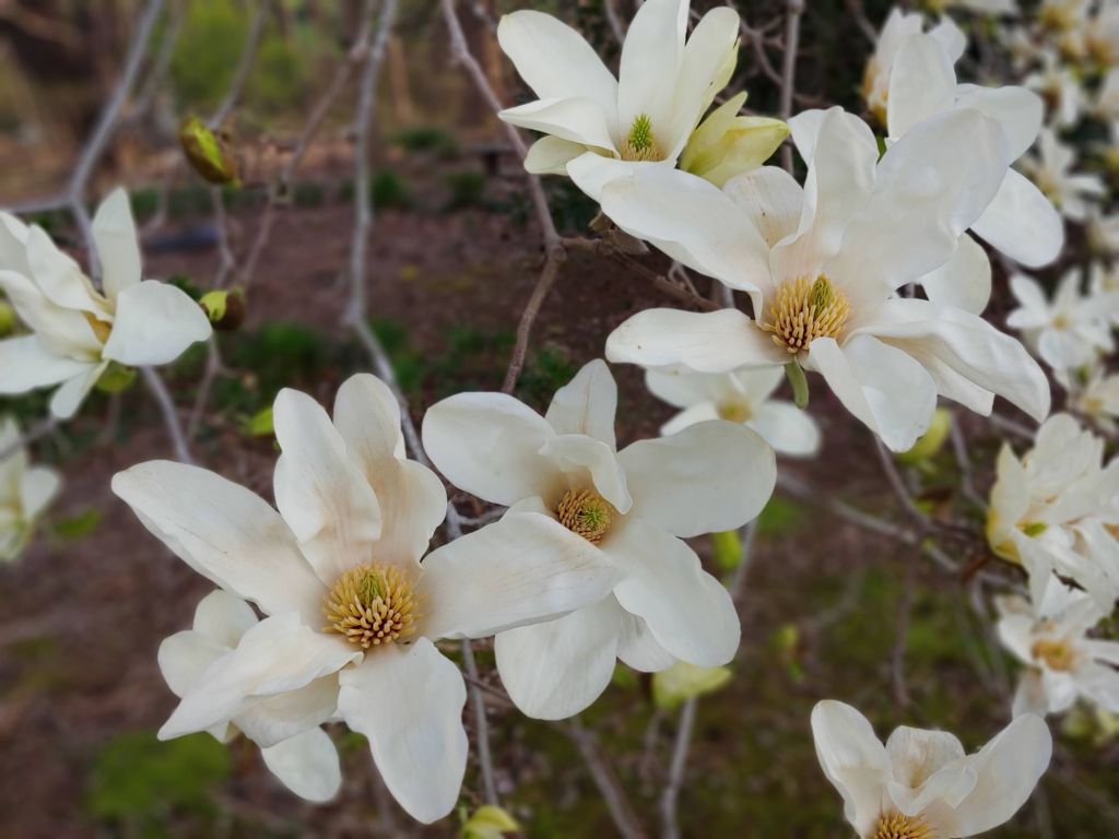 While the possibility of cold damage to flowers of early flowering magnolias might eliminate their consideration in a smaller garden, the varying flowering times of multiple selections in this garden ensure that at least some will flower and fade without damage.