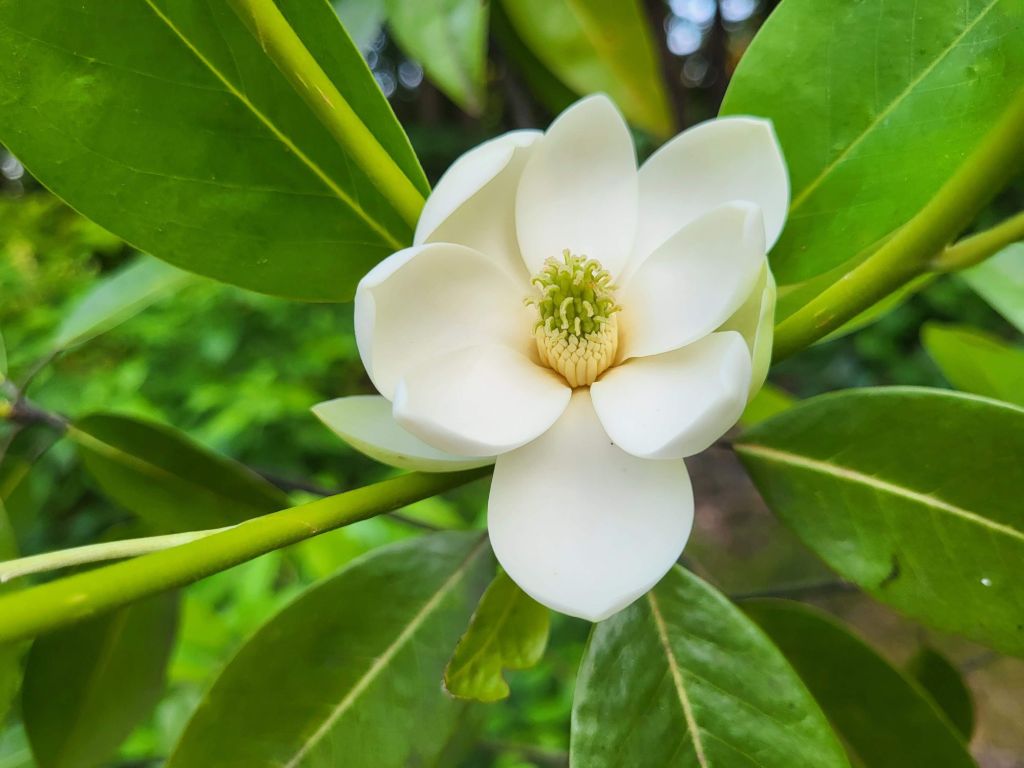 Evergreen magnolias ‘Bracken’s Brown Beauty’ and Greenback (M. grandiflora) and two semi-evergreen Sweetbay magnolias (M. virginiana) flower months later. Both tolerate full sun or shade and varied soil moisture, including the very damp rear garden. Unfortunately, lower branches of the prized Bigleaf magnolia (M. macrophylla) have been lost as its surrounding shade has increased so that huge leaves and flowers are now visible only at a distance.