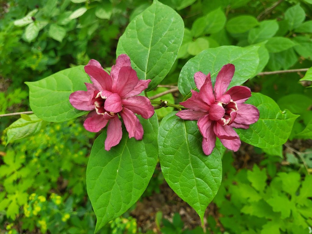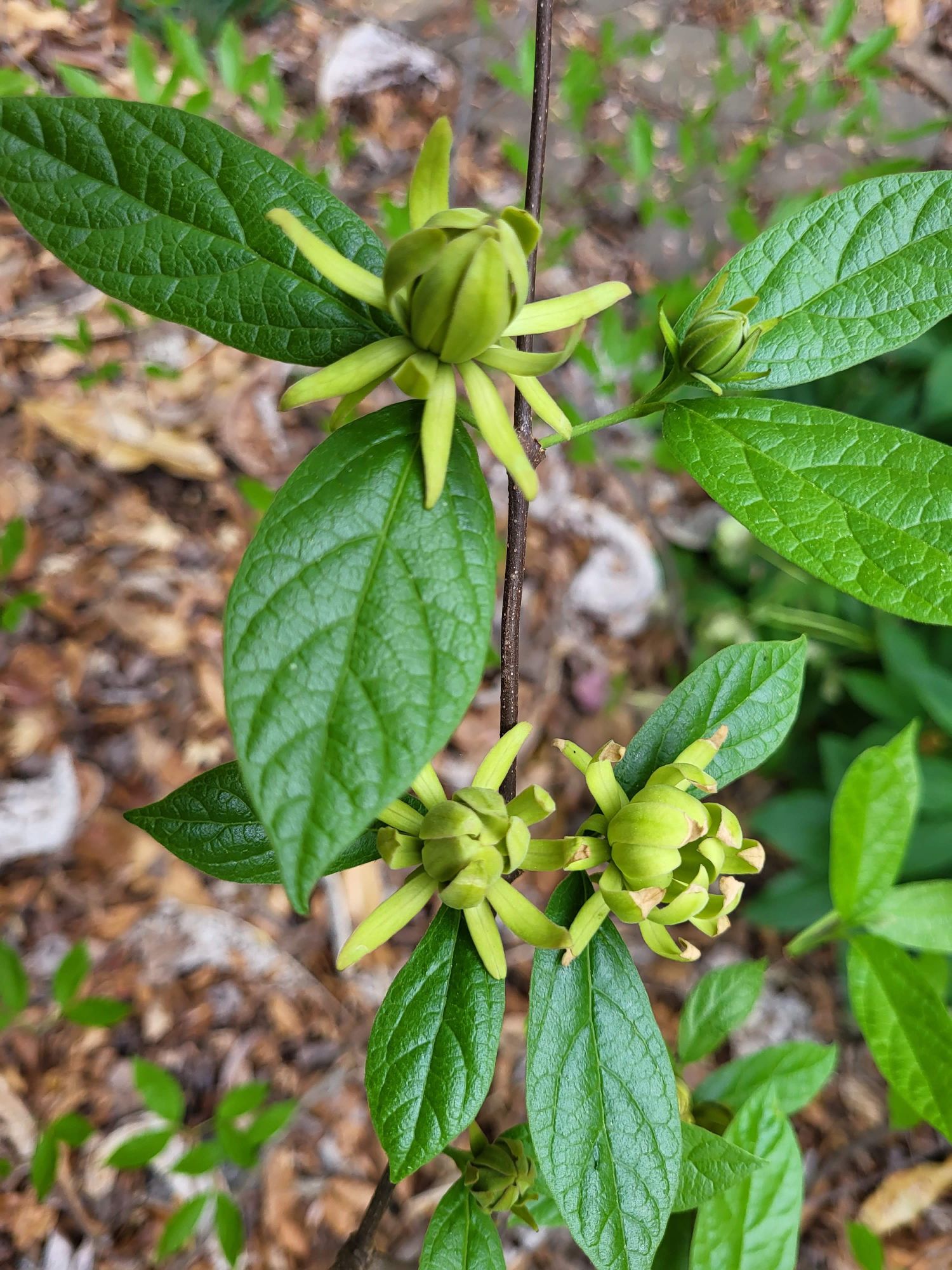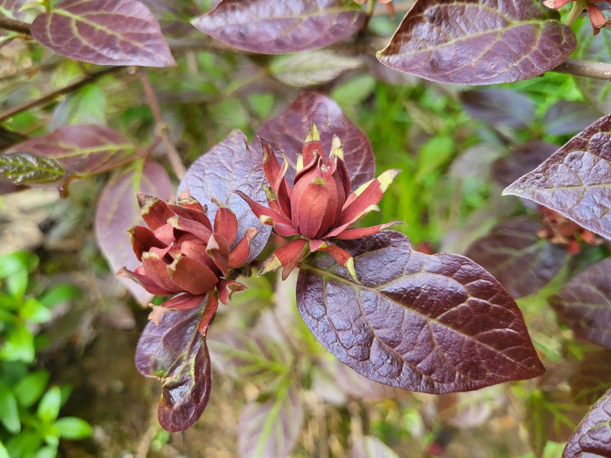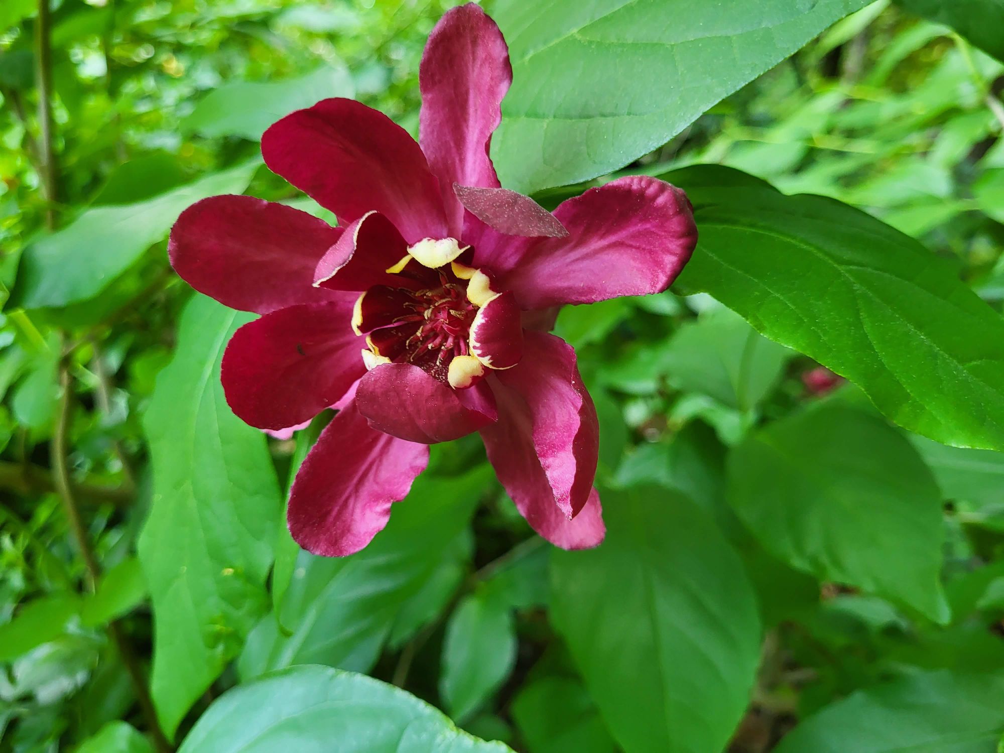 In close proximity to the bigleaf and sweetbay magnolias in part shade is a small collection of sweetshrubs (Calycanthus). The native (C. floridus) is first to flower in early spring, but often accompanied by the pale yellow ‘Athens’ and ‘Michael Lindsey’. Soon to follow are hybrids ‘Venus’, ‘Hartlage Wine’, ‘Aphrodite’, and the recently planted, dark leafed ‘Burgundy Spice’ that has grown vigorously in part sun.