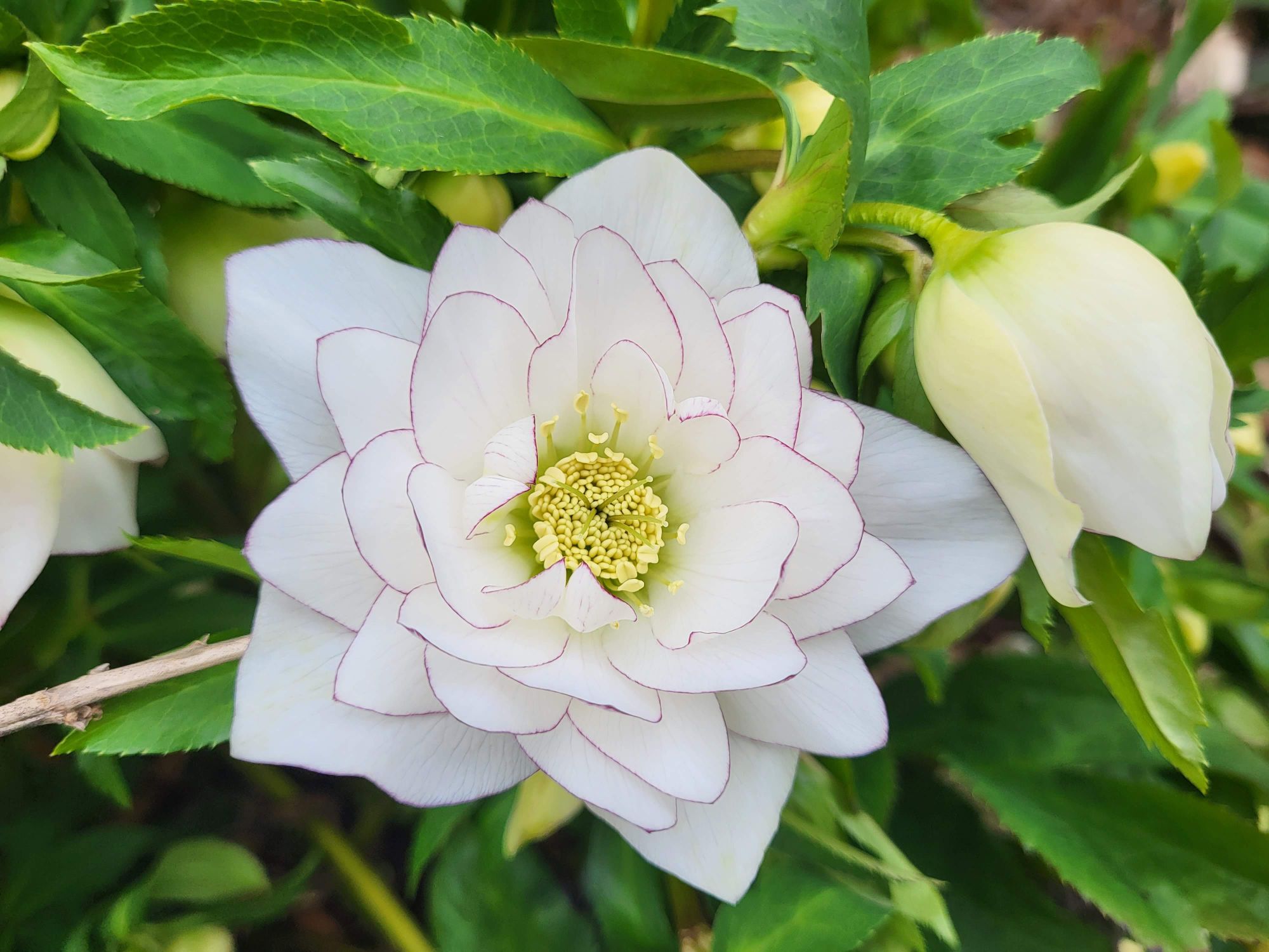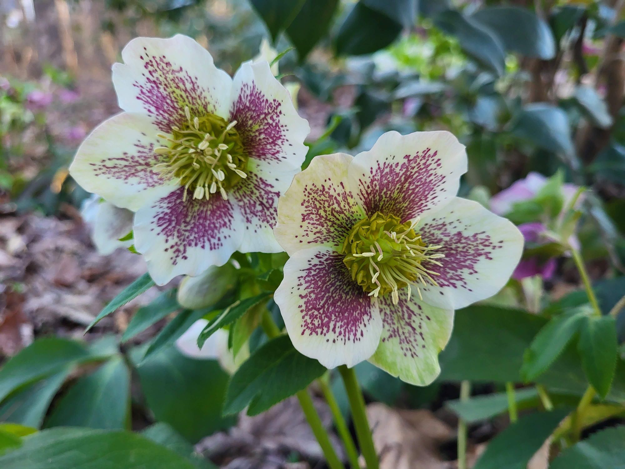 The Christmas rose (H. niger) begins flowering early in December, with hybrid varieties beginning to bloom as these fade in January and continuing into March. Seedlings of Stinking hellebores (H. foetidus) add textural, finely divided leaves, while other seedlings might have unremarkable light green flowers or ones with splendid markings. All are treasured, and additions will continue as ones catch my eye.