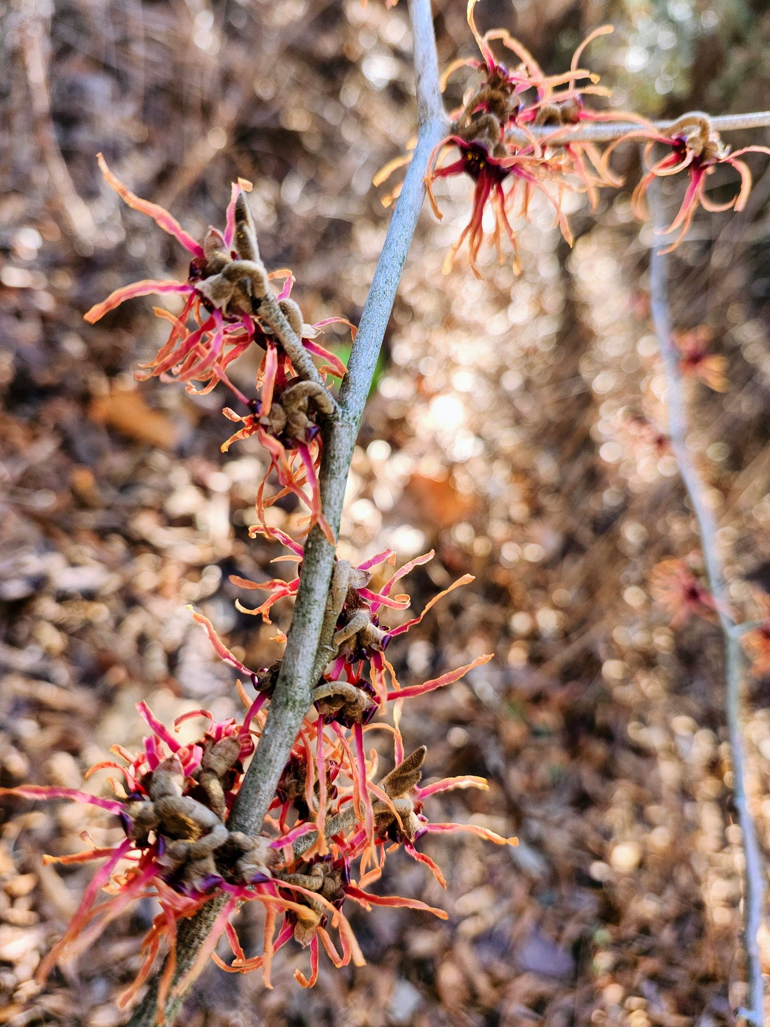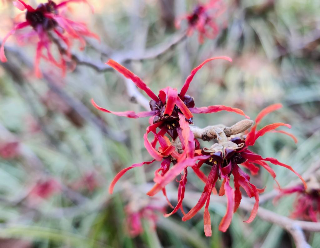 While the yellow flowered ‘Wisley Supreme’ is still a bit spindly, it survives and now joins the red ‘Diane’ (Hamamelis x intermedia ‘Diane’, below) and coppery orange ‘Jelena’ that also begin flowering late in January. Two similarly yellow flowered ‘Arnold Promise’ will flower a week later.