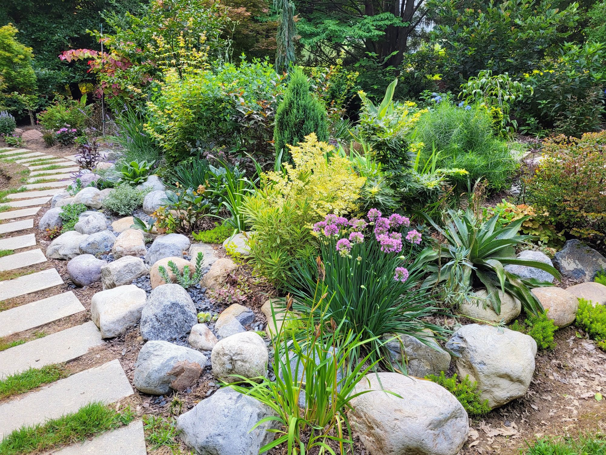 Two years ago, the damp, weedy lawn in the lower, rear garden was dug out. The sod and soil were mounded to create a drier, raised planting area that has been quite successful (above and below).  Exaggerated drainage trenches were dug to carry away rainwater that flows in from the neighboring property, and now I begin to plant this void that is bordered by granite stepping stones.