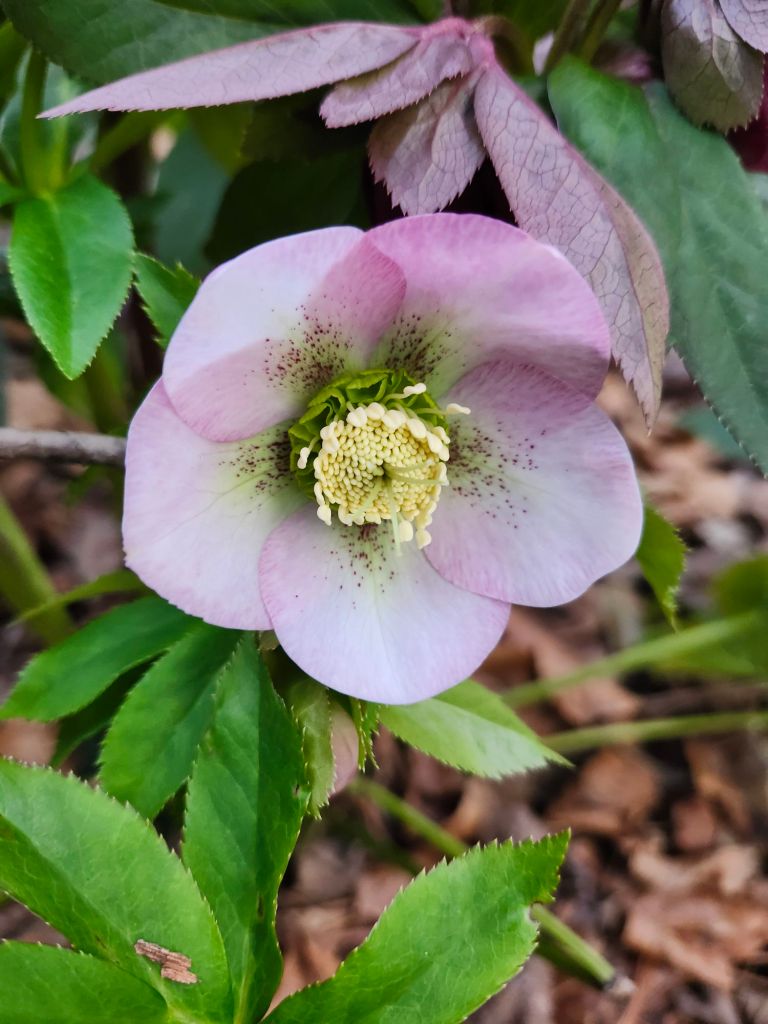 Beneath the skirt of foliage of many hellebores are dozens of seedlings. In the garden, there are thousands that must be weeded out or transplanted. Most are moved or discarded long before flowering, but I must be excused for missing several, and here is the result of my sloth.