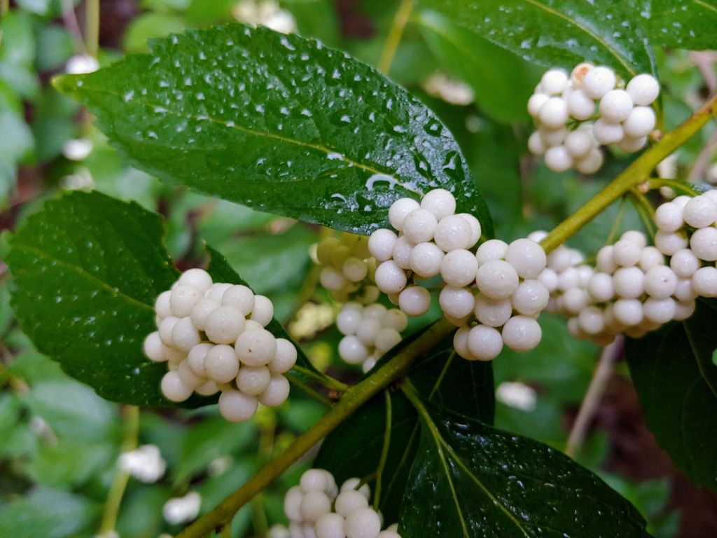 Later in the season, the lower branches of ‘Okame’ become a stepladder for a seedling of the white-berried beautyberry (Callicarpa dichotoma ‘Albifructus’, above) that climbs to double its unsupported height, and a native, yellow flowered passionflower vine (Passiflora lutea, below). The beautyberry was chopped in half a year ago, so it hardly showed through the cherry, and I have long regretted moving the vigorous passionflower from its previous perch to a new home sprawling through ‘Okame’ where its marvelous blooms can not be enjoyed close up.