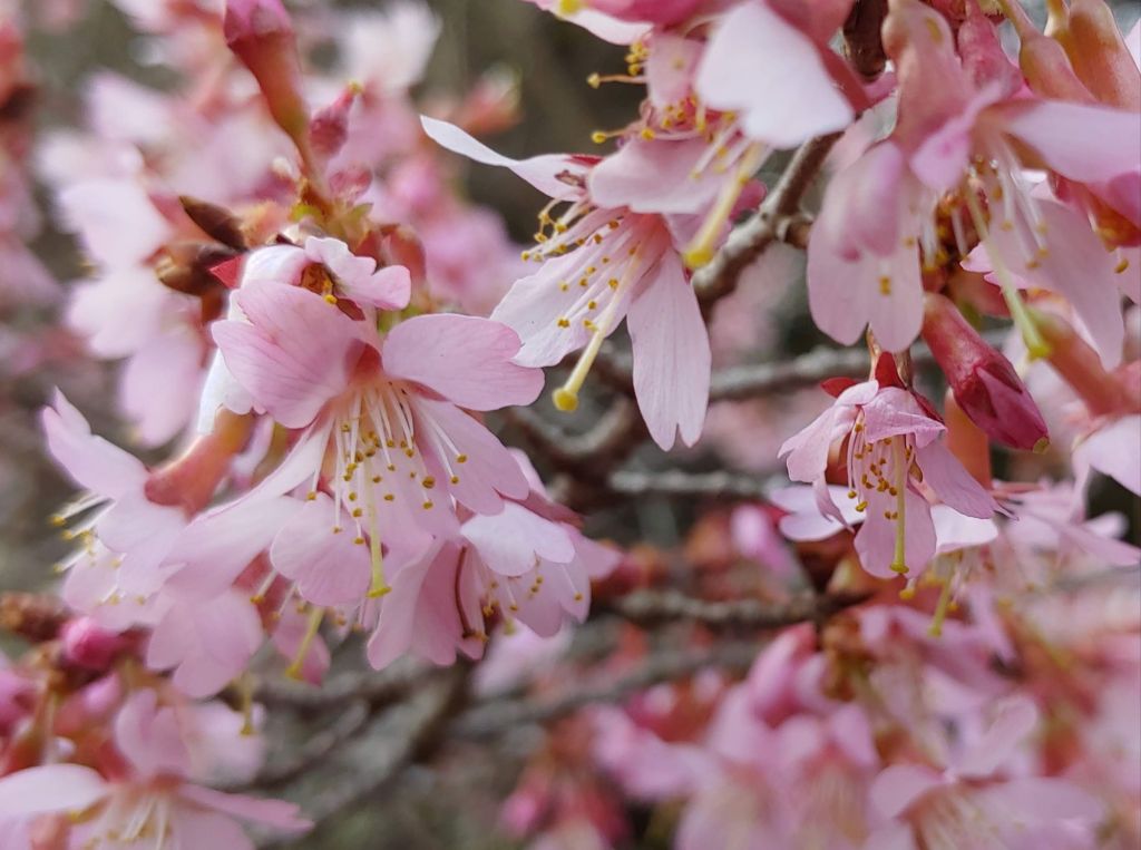 A year ago, the ‘Okame’ cherry (Prunus ‘Okame’, below) bordering the koi pond flowered gloriously alongside the massive paperbush (Edgeworthia chrysantha), both in the last week of February. While paperbushes have flowered here as early as late January, this was the earliest bloom I recall for the cherry.