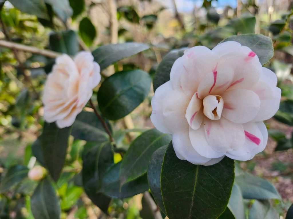 The spring flowering (Camellia japonica) and two tardy autumn flowering camellias are nearing their peak bloom a few weeks later than a year ago, but with more typical timing. Flowers of ones in colder areas of the garden show some damage from the freeze, but another degree or two colder would result in many browned flowers. Fortunately, unopened buds remain that will continue the camellias’ flowering.