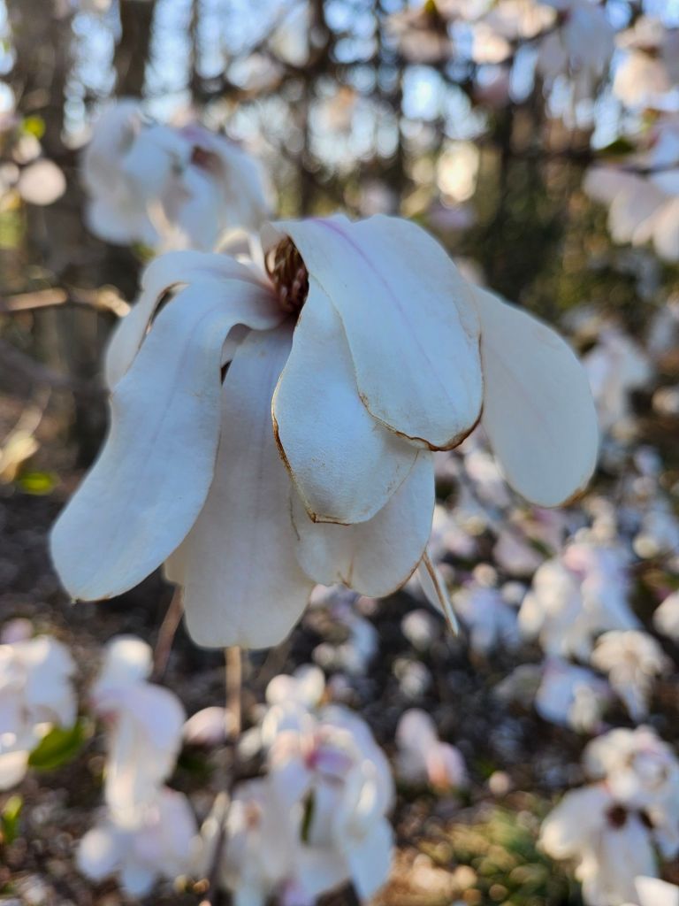 The small rear lawn is littered by petals of ‘Merrill’ magnolia that drift on the breezes. Six days of peak flowering were a bonus before a twenty-five degree (Fahrenheit) freeze began a decline that will soon turn today’s limp flowers to brown mush. The gardener disturbed by the nearly annual freeze damage should simply plant some other tree since no protection against cold is practical.