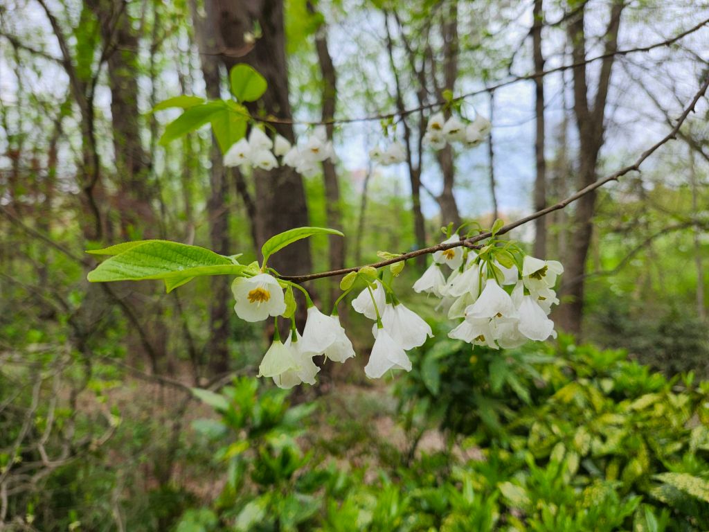 The garden begins to fill with flowers in March with bulbs, then magnolias and camellias, but early April flowering of redbuds, then serviceberries, dogwoods, and Carolina silverbell (Halesia carolina, above) begins an extraordinary progression. Late in April is particularly delightful, but so are the weeks to follow until the heat of summer tempers the garden’s exuberant growth.