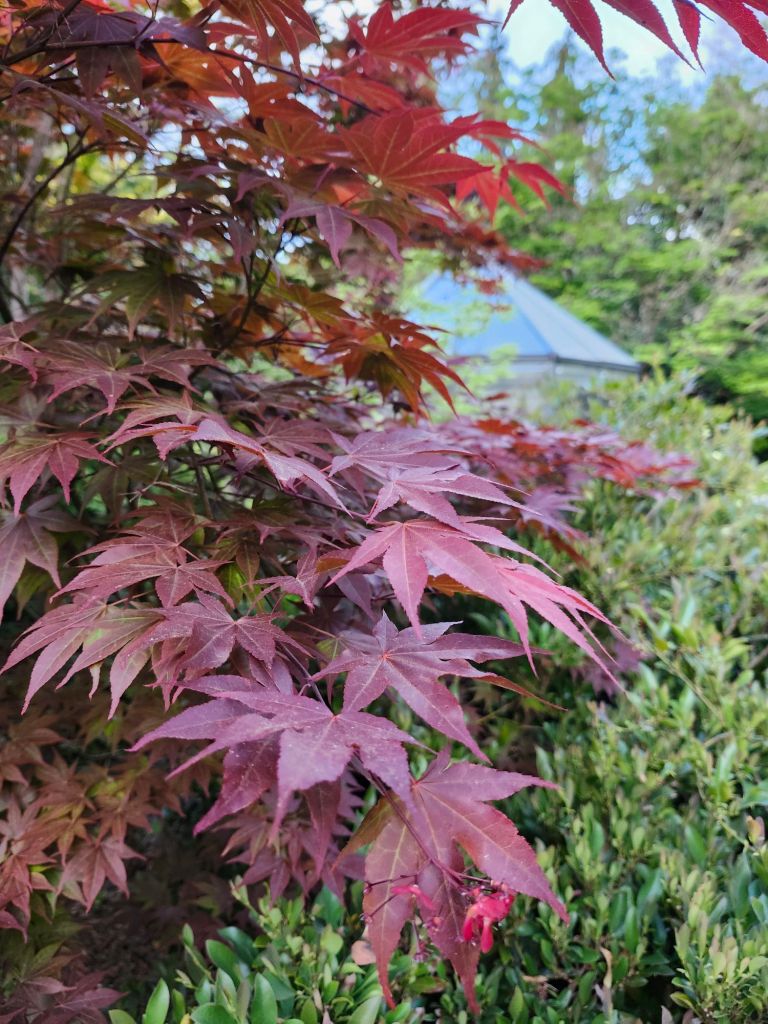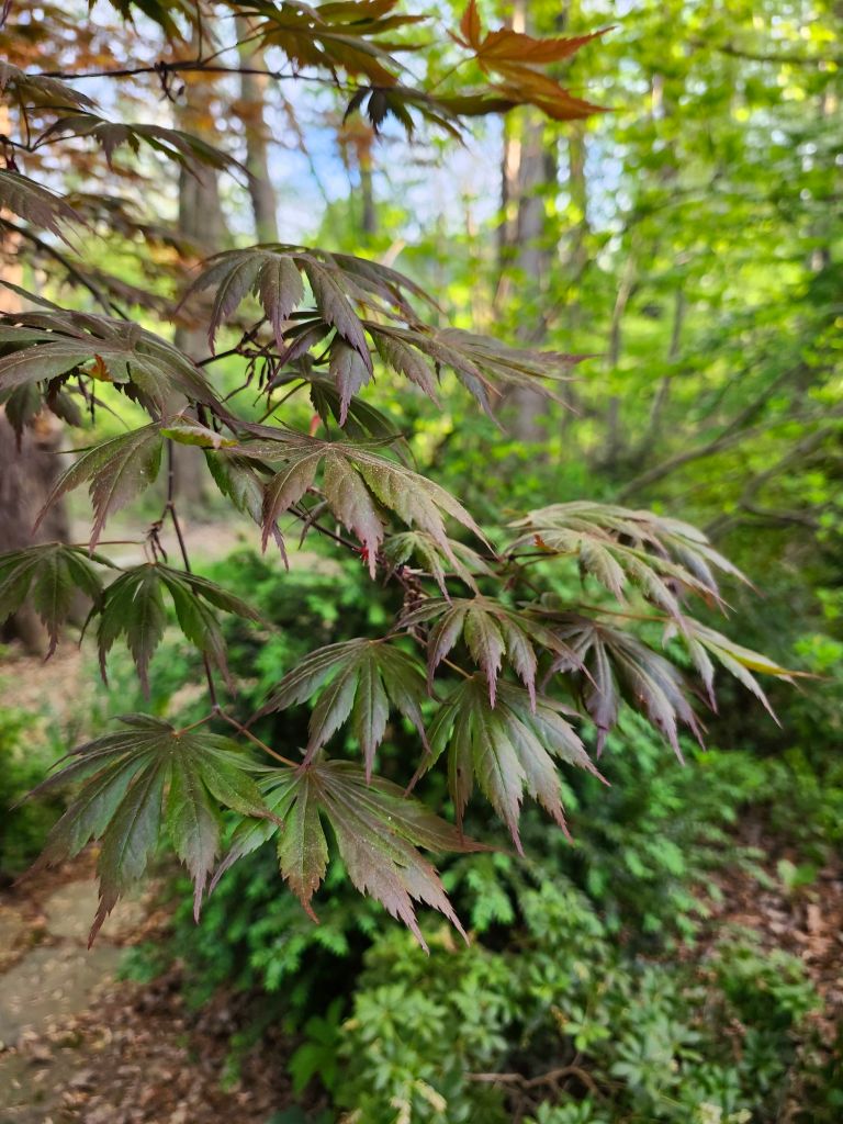 With a modest collection of Japanese maples (below), I am enthused by the vibrant colors of newly emerging leaves. Colors will fade to varying degrees by July, but in full leaf, the maples enclose each area of the garden. A narrow glimpse beyond entices the visitor further into the garden.