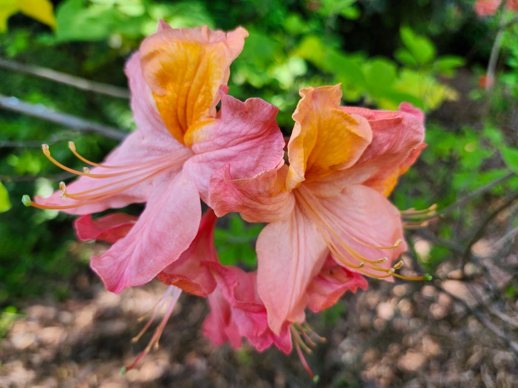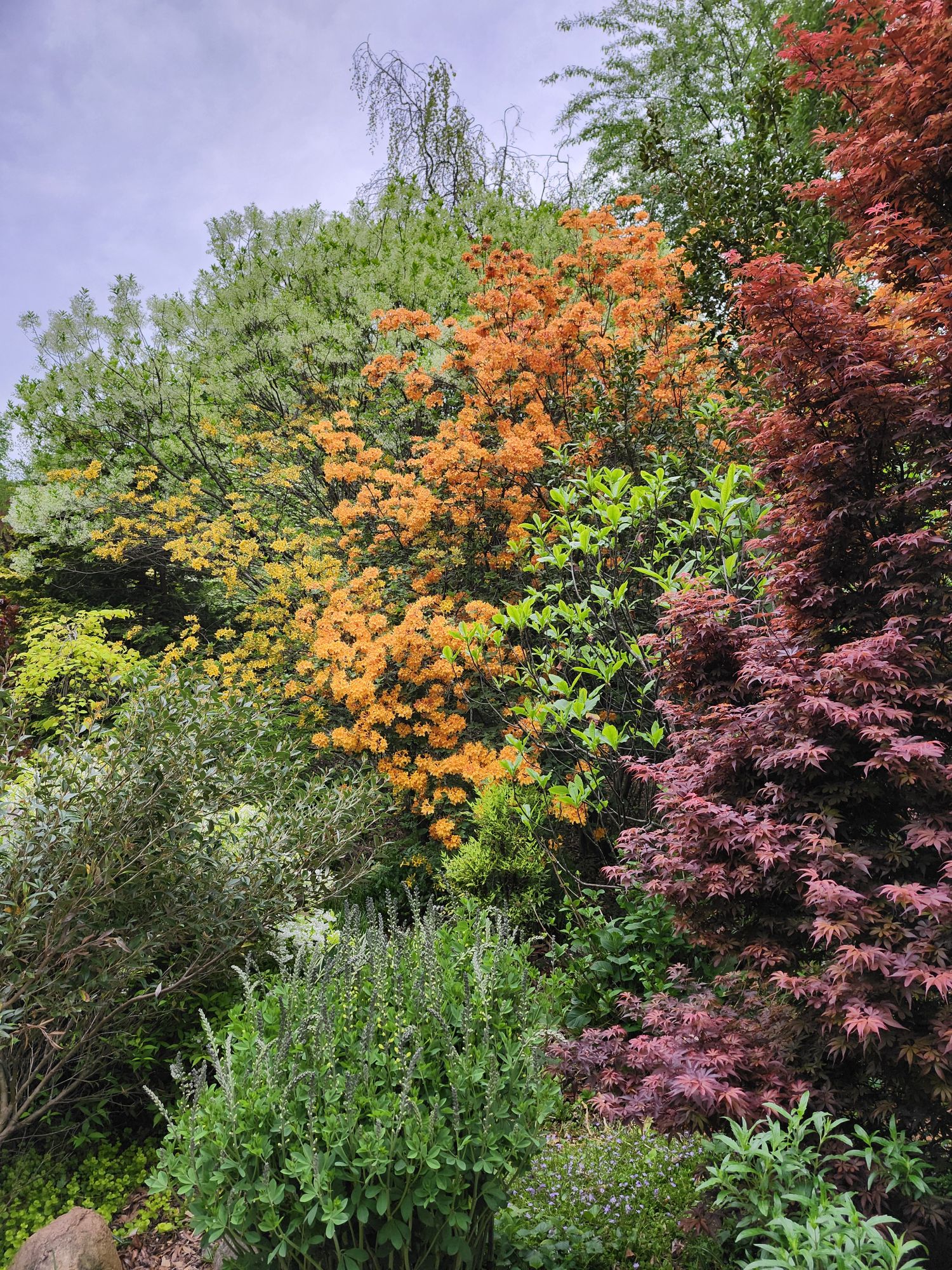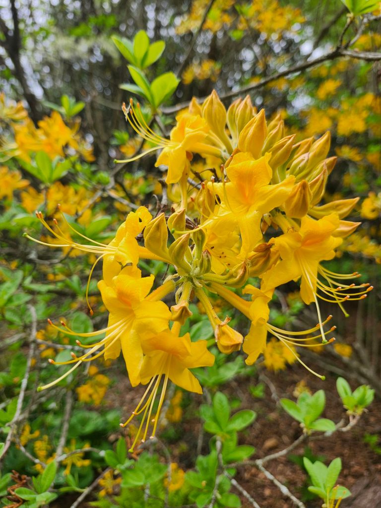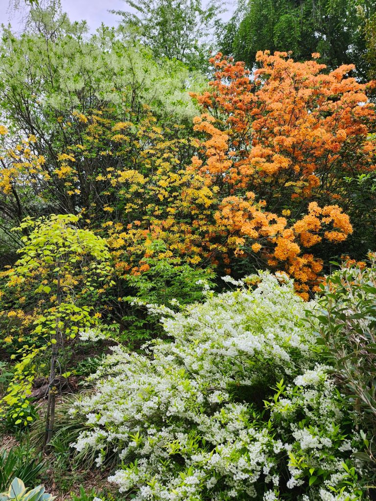 On the sunnier side of the property, a handful of deciduous azaleas were planted. All are fragrant, though I can’t smell a thing, but what I like most is the colors that are considerably brighter than their evergreen cousins. And, all have grown to fifteen feet so that the top of the fringetree stands just above while all flower simultaneously.