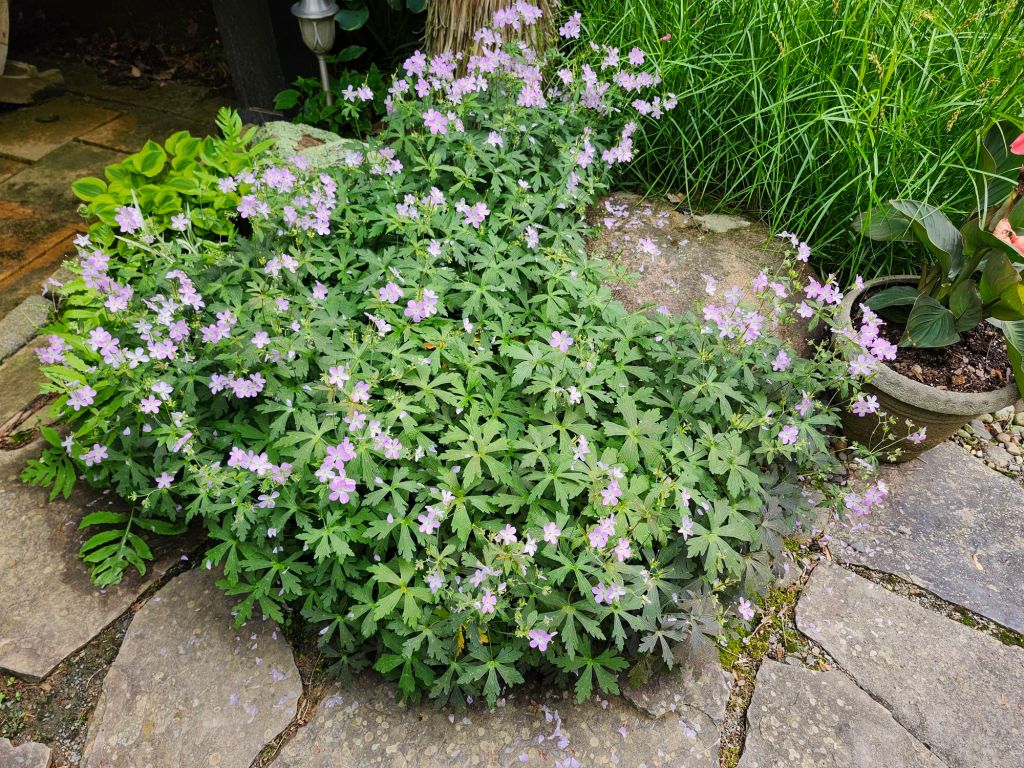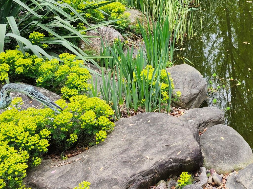 But the geranium continued to expand its territory, little by little, until the last tiny clump of cypress spurge had to be rescued to transplant between boulders nearer the pond. Here, it slowly spreads, though I am watchful to remove geranium seedlings before they bully the supposed thug into submission.
