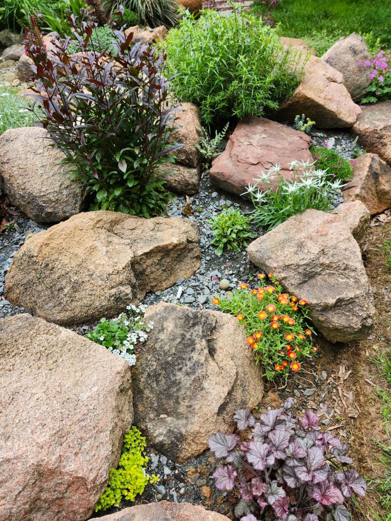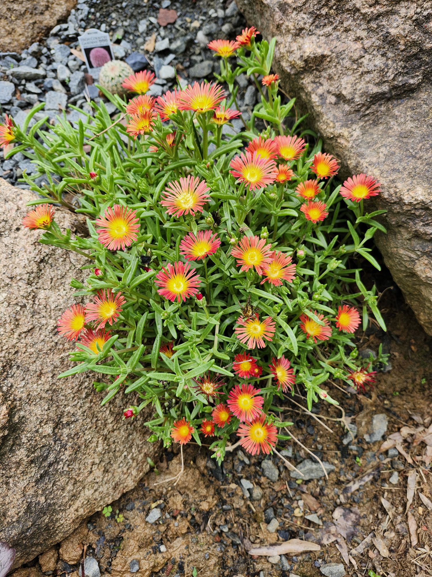 The rock gardens (above) started a year ago have allowed planting of lavender, rosemary, ice plants (Delosperma,below), and others that could not be grown in clay soil. With more planting this spring, I’ve run out of space, and certainly some editing will be required as some vigorous spreaders threaten clumpers in the gravelly soil. I’m still figuring it out, but pleased to finally be able to include these curiosities in the garden.