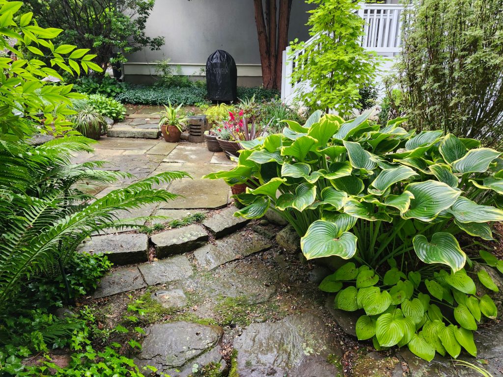 And yes, I had considered plucking this fern out, probably several times in recent days as fronds splayed after rainy days. But the path is not fully obstructed, so there’s no hurry. I regularly chop out sections of the vigorous Ostrich fern that threaten smaller treasures in this part of the garden. I see it and pull it, even if I’m unable to pull the root. If I delay to grab a tool, it’s likely I’ll be delayed by a dozen distractions and never end up back to remove the fern. Better to do it halfway than not at all, I guess.