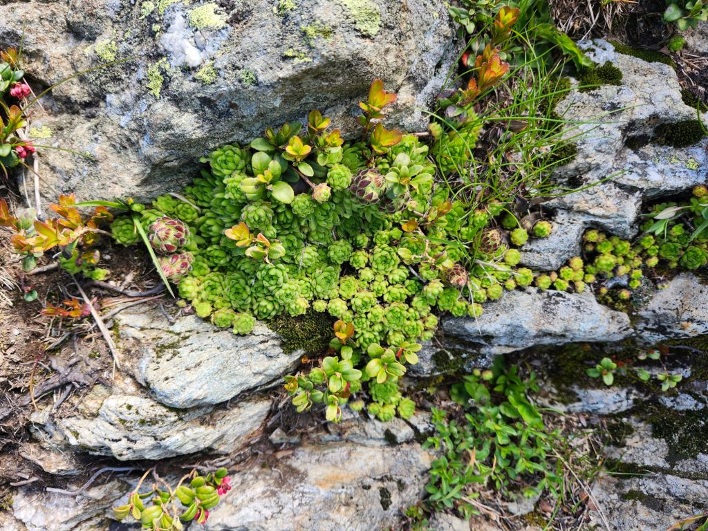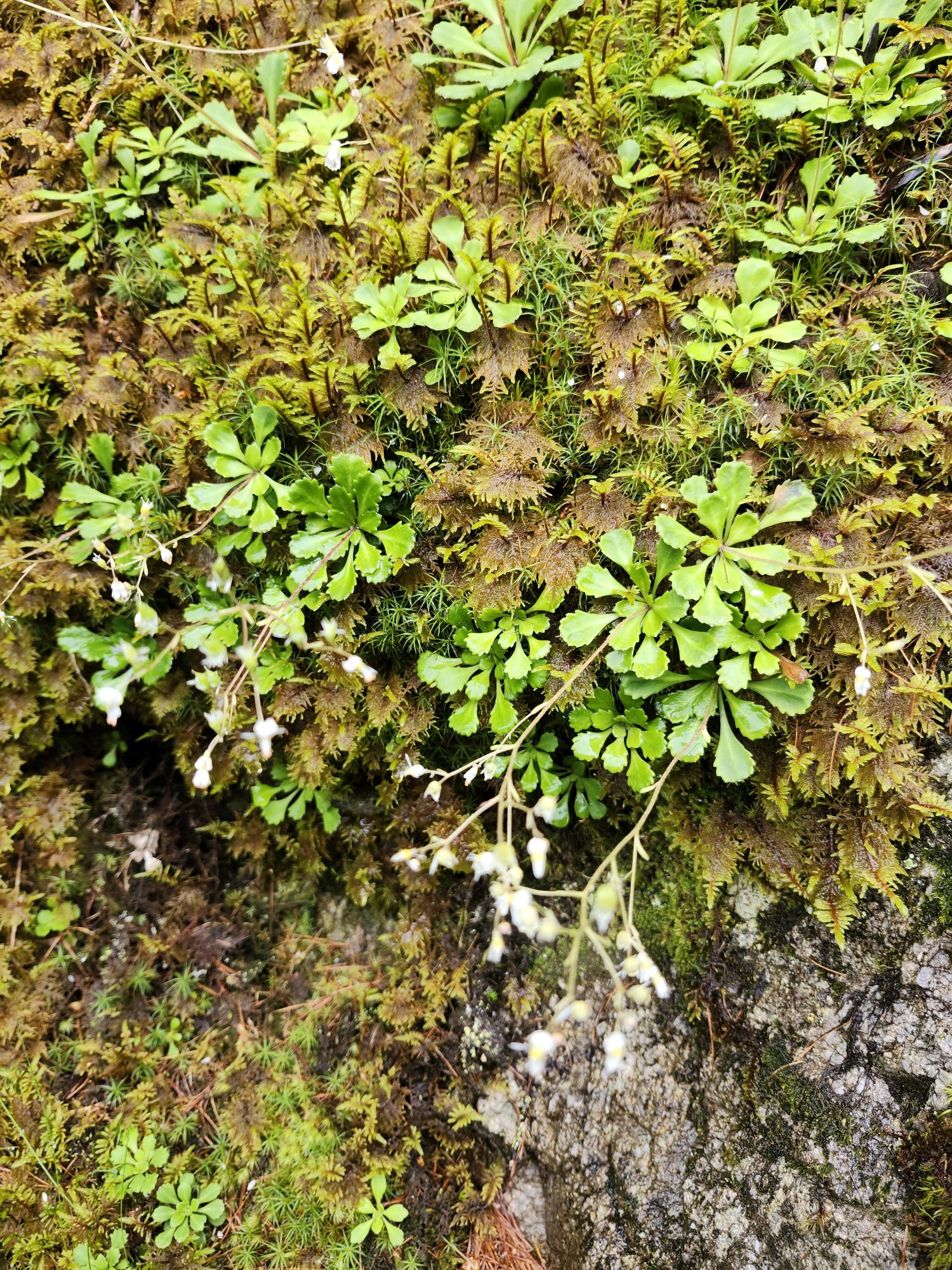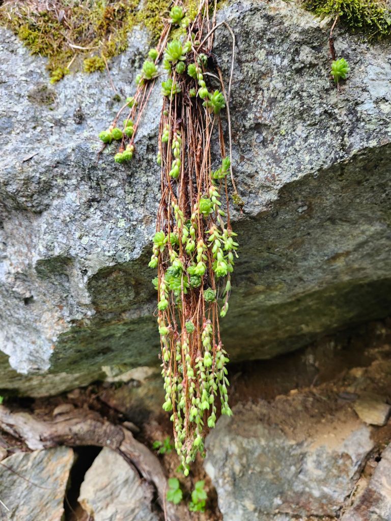 Further up the slope are walls of stone not suitable for an aged hiker, but off trail again, I see succulents growing in the crevices. I suspect most are sedums (above), and some I positively identify as saxifraga (below). I enjoy the hike, but just like strolls in our nearby Blue Ridge, my eyes focus on flora as I sometimes stumble over stone outcroppings. In a few areas, I must focus on the trail ahead or risk tumbling a thousand feet.