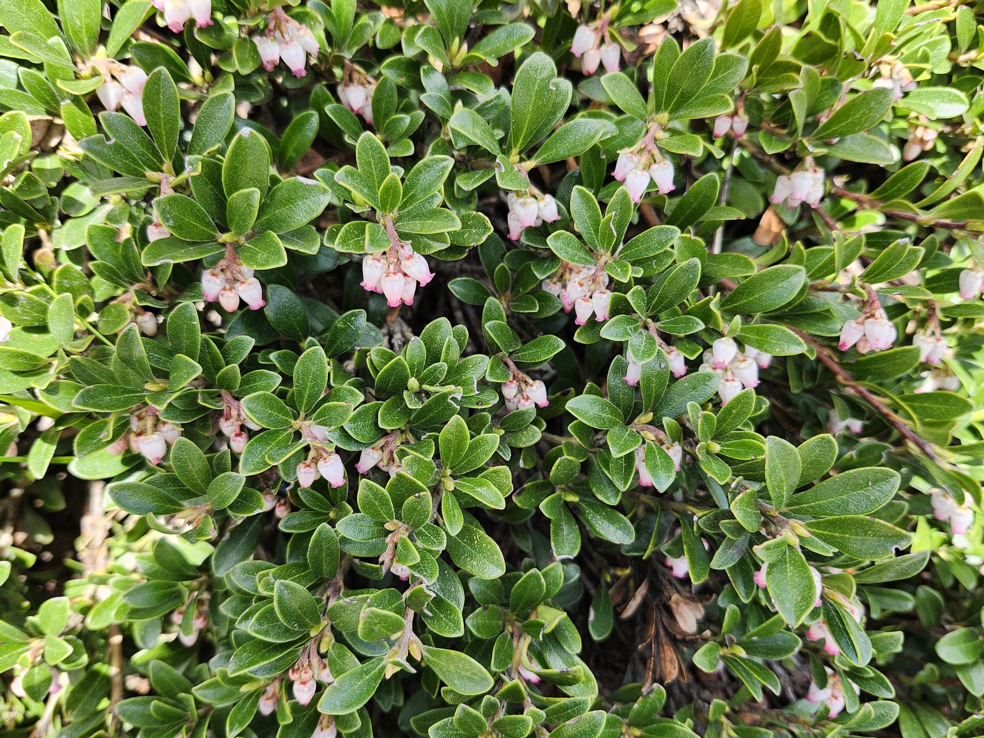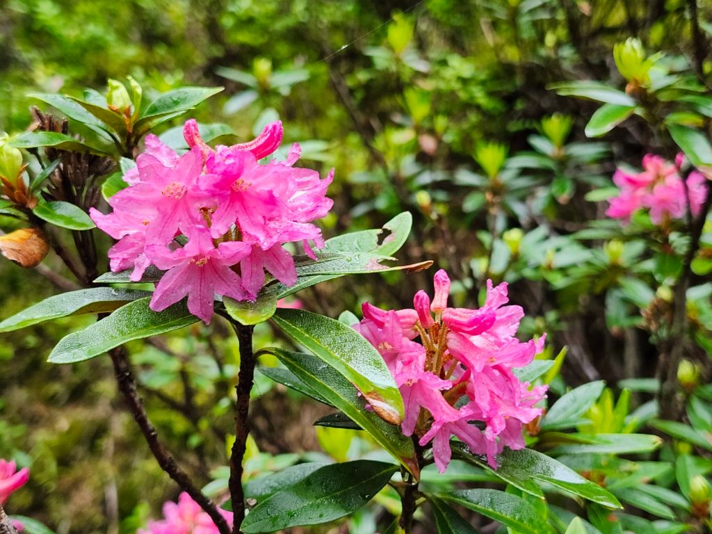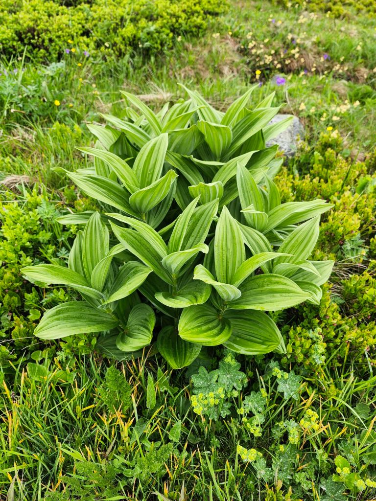 Beside rushing streams, false hellebores (Veratrum nigrum, above) emerge in their spring thaw while blueberries and rhododendron, dwarfed by their extreme exposure, bud over wide expanses. Ones a thousand feet below and in evergreen forests are in brilliant bloom (below), and the large leafed false hellebores rise to several feet.