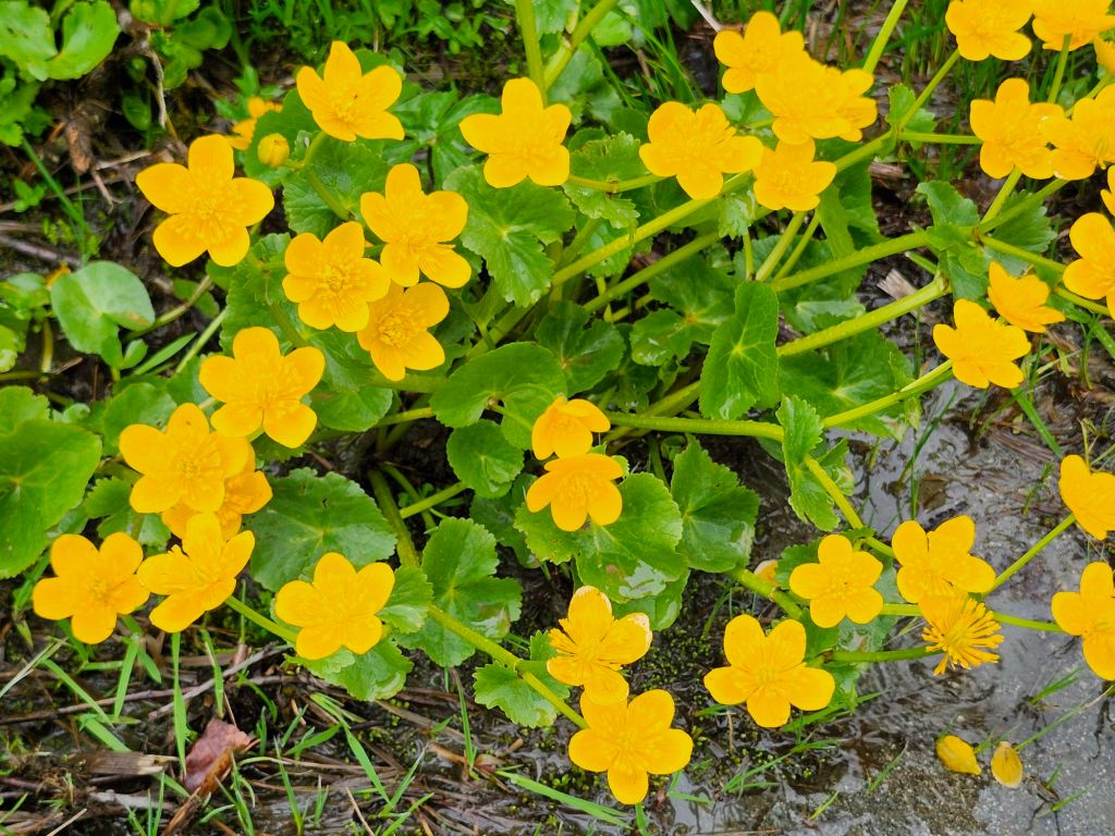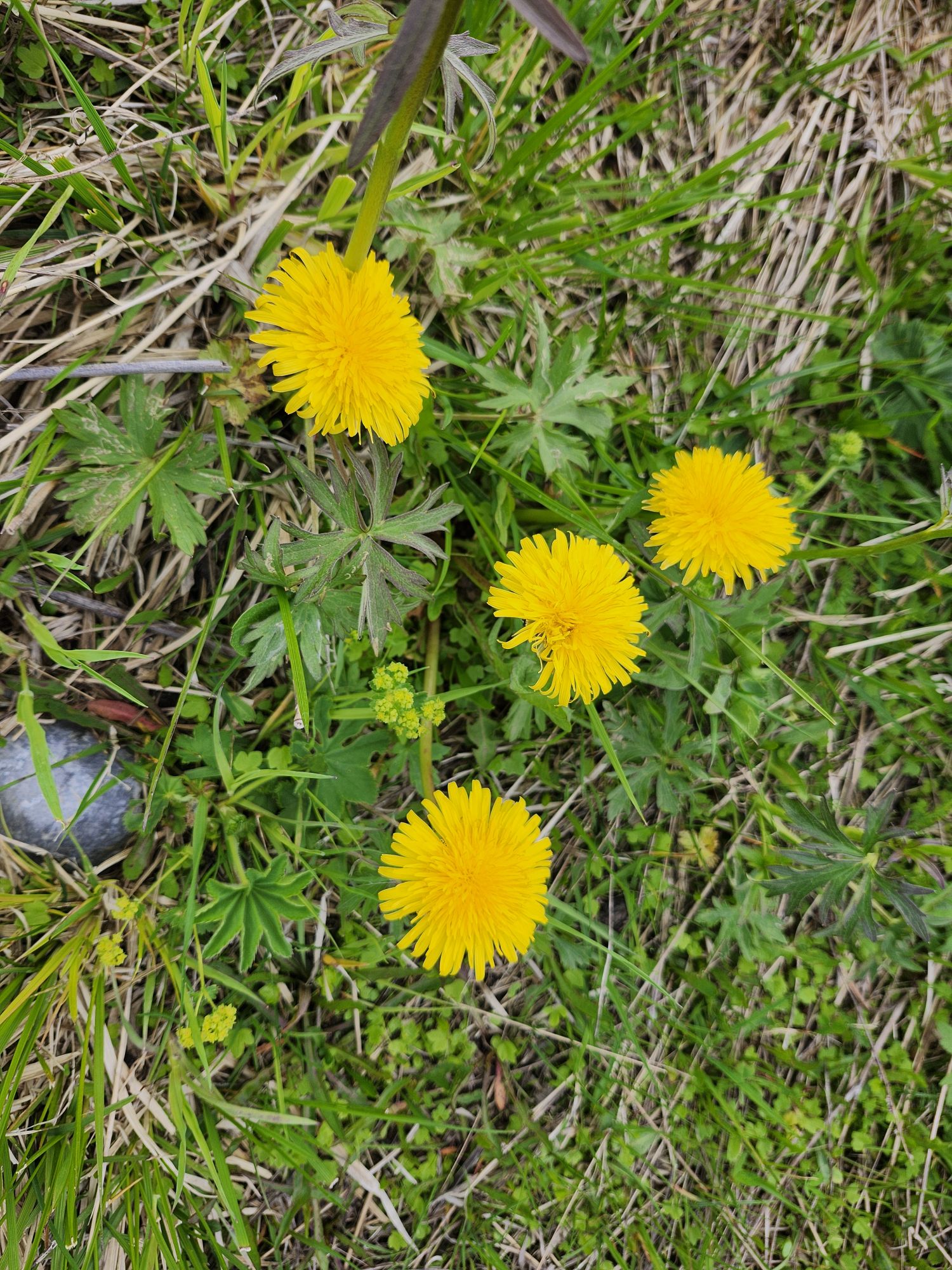 I am somewhat surprised by the abundant dandelions in this high meadow. Here, they do not invade a pristine lawn, so they can not be termed as weeds. (In my garden, ample quantities of dandelions, clover, and mazus grow in the small, scruffy areas of lawn. It is mowed every few weeks, so all are often in bloom and never considered weeds.)