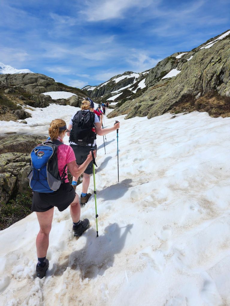 The third day, we ascend to a higher elevation (7500 feet) with broad areas of snow, sometimes perilously undercut by the spring melt. There are numerous flows of rushing snow melt, some easily crossed but others more treacherous. Most in the group balance on hiking poles, but I dislike poles that remain in my backpack, so I must leap from one boulder to the next.