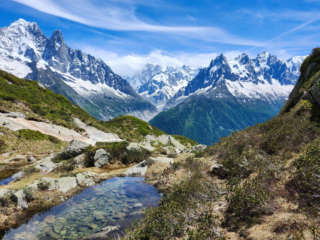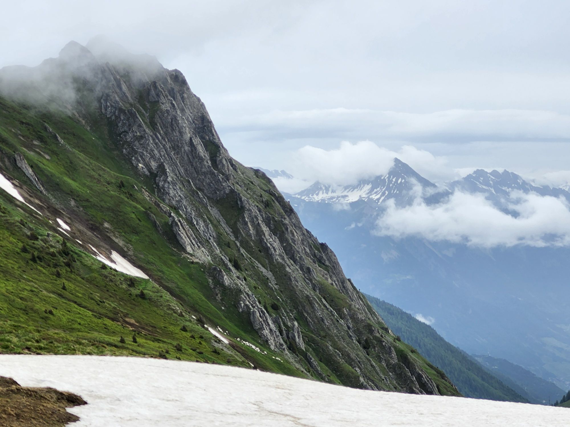 At 5900 feet elevation, this alpine meadow in the French Alps is in glorious bloom. From a distance, the flowers appear scattered and the meadow green, but as we stroll along this mountain ridge, there are countless blooms. Several hundred feet up slope are pockets of snow with water crashing down the mountain sides. Tomorrow, we hike higher.