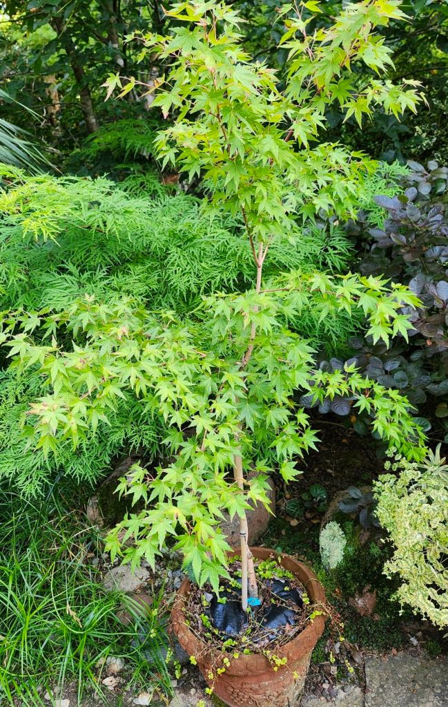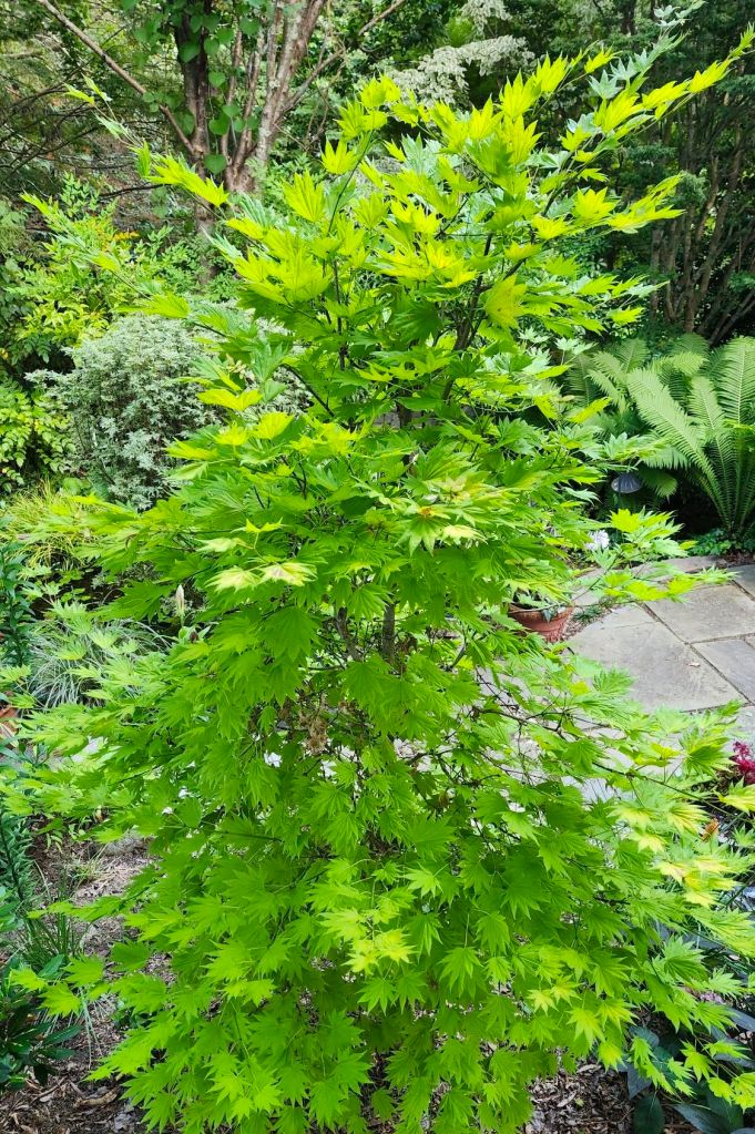 Two Japanese maples in pots have a lot of brown leaves from going dry in the recent heat spell, but I expect they’ll survive. The dozens of Japanese maples in the ground haven’t suffered at all (below), and all are just beginning to show the fading color that is typical of red leafed maples by midsummer. Occasionally, I wonder if fading would be reduced by regular summer irrigation, but most have thrived for decades with only rain, so there are no plans to change now.