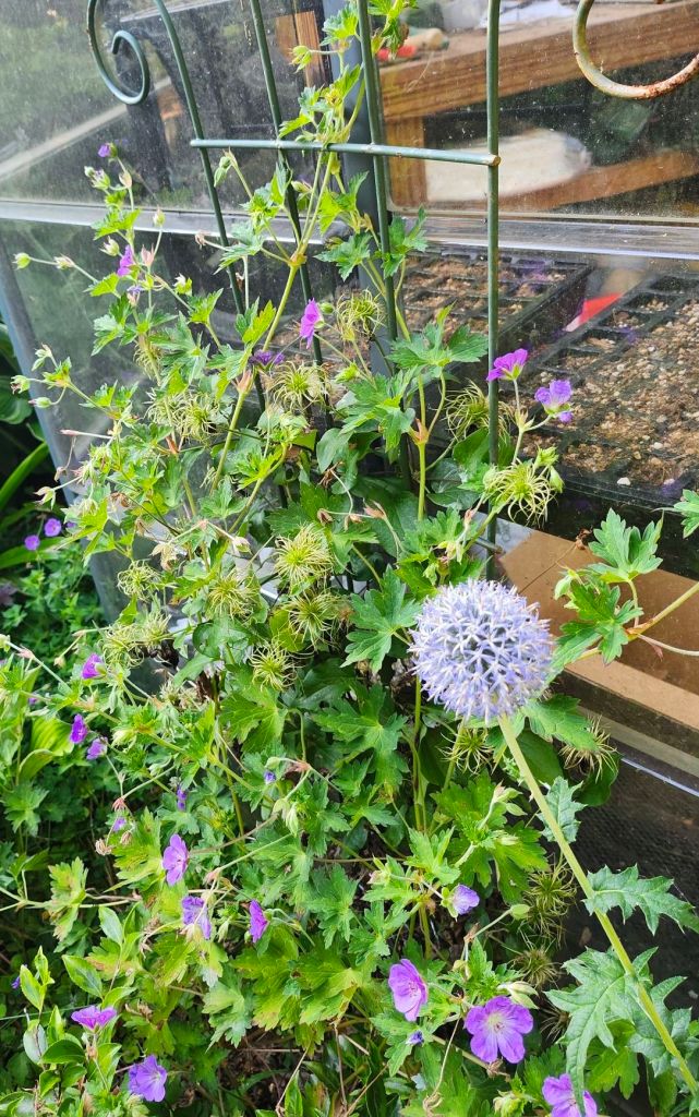 In any case, two Rozanne were planted, one at the forest’s edge where it gets late afternoon sun and tumbles over rocks. The second was planted on the slope of the lower side of the small greenhouse, and this one in particular has shown rambunctious growth. Wandering stems have climbed over neighbors and up the trellis of a past bloom clematis. I’m not one to interfere much with happy plants, but it’s clear Rozanne will require attention so she doesn’t overwhelm every neighbor.