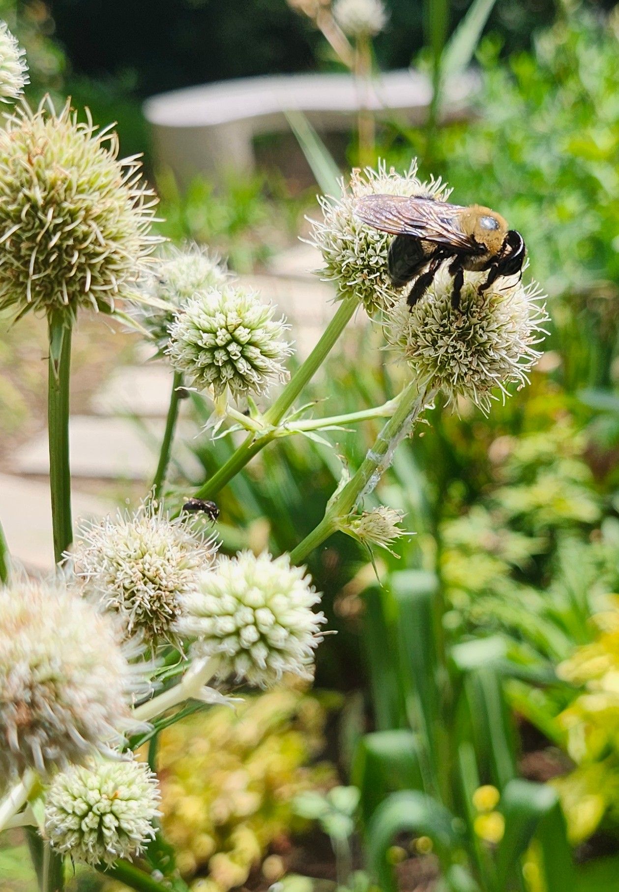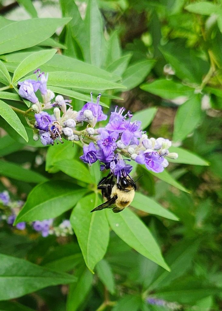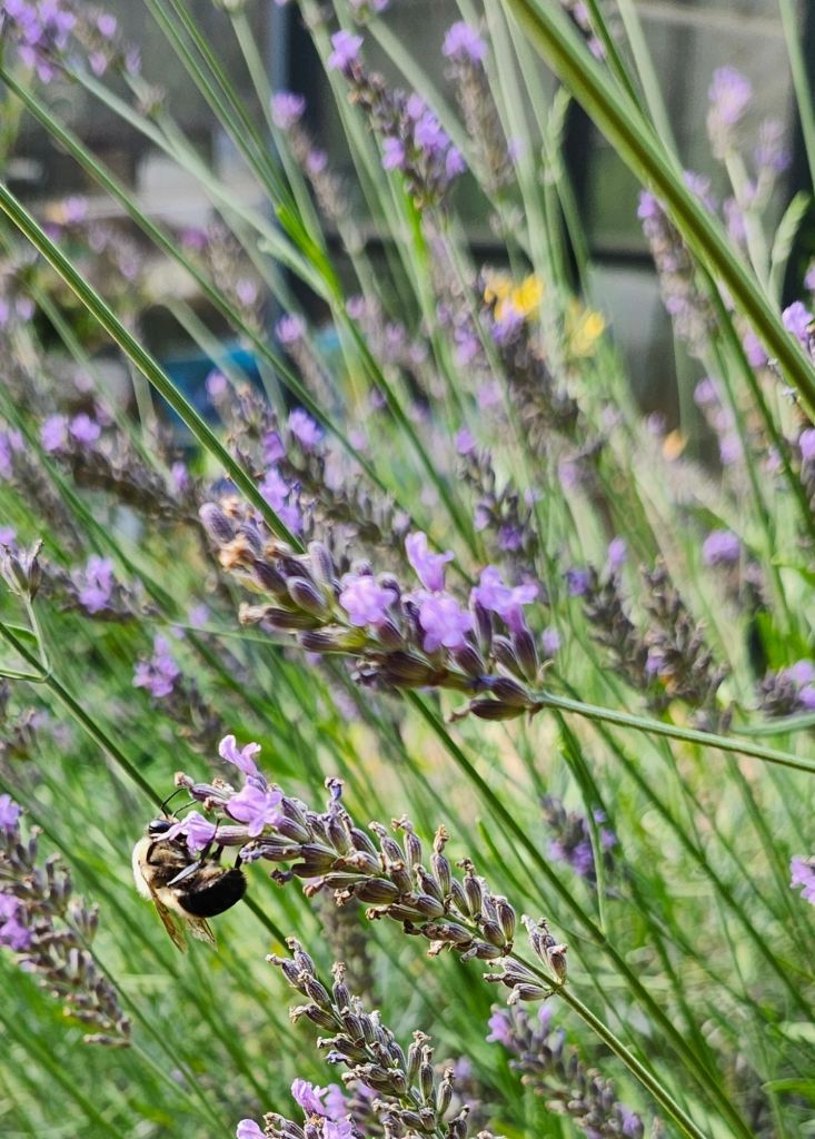 In early July, long, flowering stems of lavenders sway, not in the gentle summer breeze but under the weight of bumblebees and carpenter bees moving from one flower to the next. Following construction of two small rockeries, the concern is not if lavenders will survive (in the native clay soil) but that they will become too massive in size, obscuring other beauties. Bees have no such concerns, requiring only more blooms over a longer period.