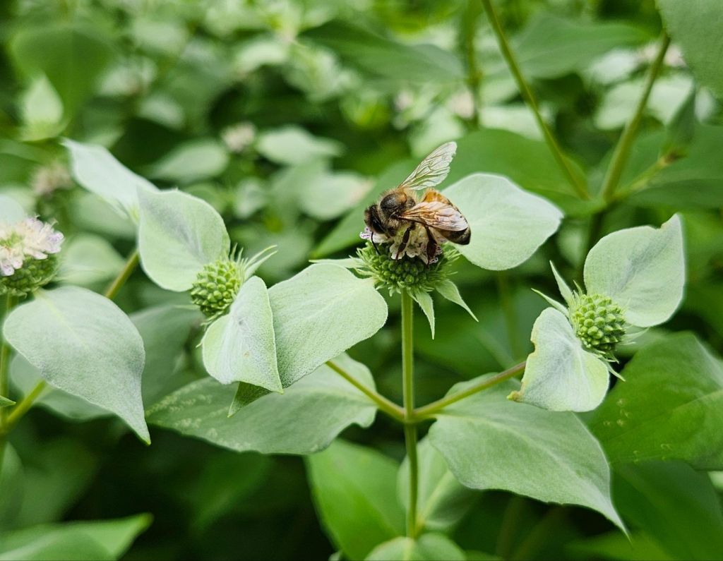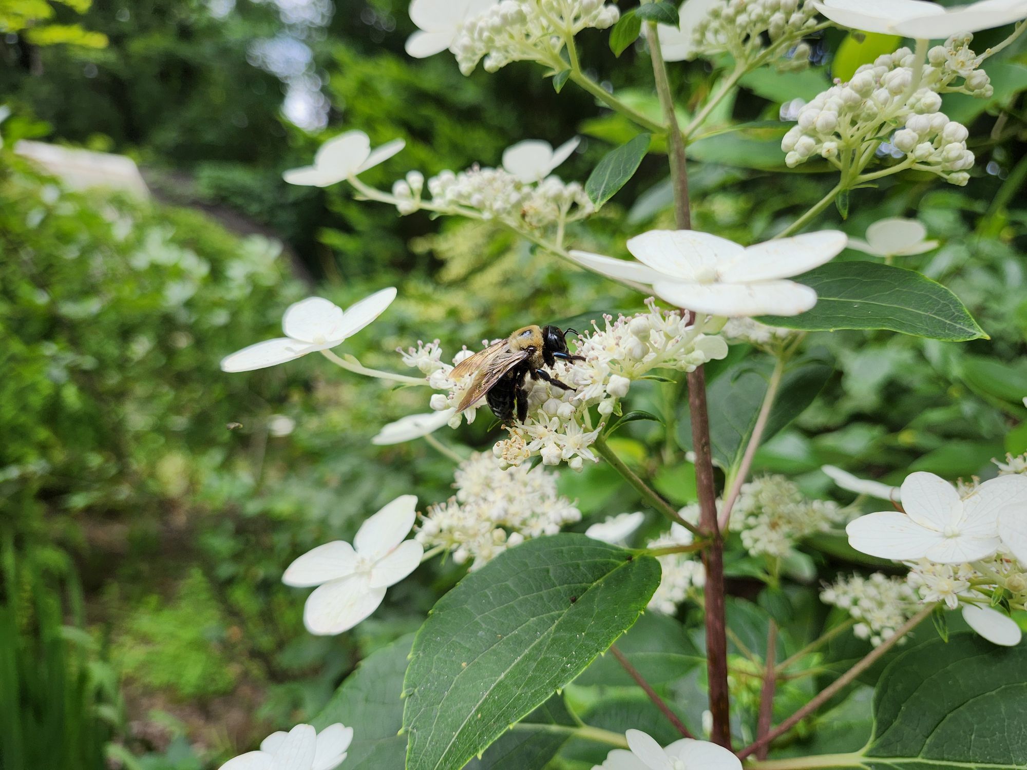 The garden attracts abundant numbers of pollinators from spring into early summer, but none to compare with midsummer once mountain mint (Pycnanthemum muticum) and Joe Pye weed (Eutrochium purpureum) come into bloom. Questions about diminished numbers of swallowtails are quickly answered as scattered clumps of Joe Pye begins to flower, and attempts to catalog the types of bees, wasps, and hoverflies are abandoned in the chaos of pollinators moving between flowers of the large clump of mountain mint.