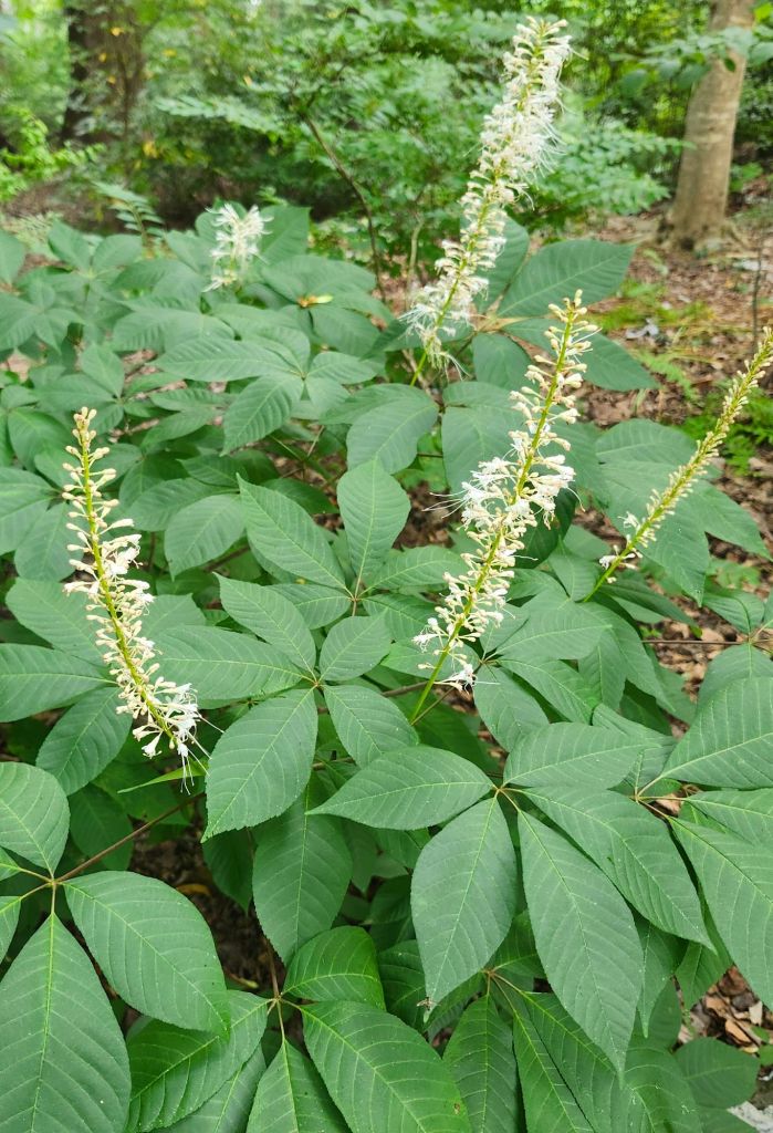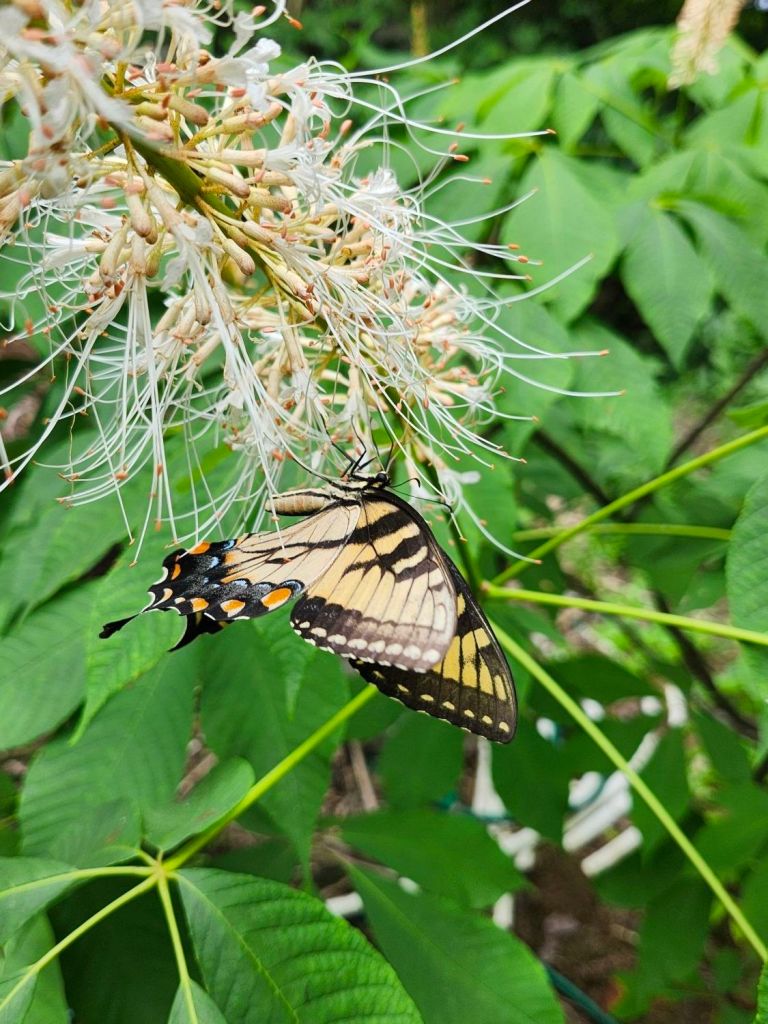 As flowers of bottlebrush buckeyes (Aesculus parniflora, above) reach their peak, Joe Pye weeds (Eutrochium purpureum, below) are beginning to bloom with an immediate increase in the quantities of butterflies. The garden’s lone butterfly bush (Buddleja) is a lesser, third option as swallowtails cross the garden.