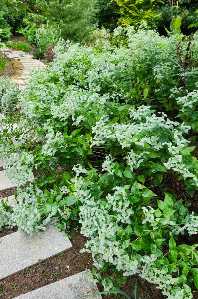 Strolls through the garden have continued, though I suspect the timing has shortened in the afternoon heat. I continue to pluck weeds as I walk the paths, marveling as I go at the abundant pollinators. The buzz of huge numbers of bees is evident, even with my diminished hearing, as I pass flopping stems of mountain mint (Pycnanthemum muticum, above) in the lower rear garden. As flowers lean over the stone path, I am cautious in passing close by frantically feeding bees and wasps that rarely take notice except to detour around me to the next available flower.