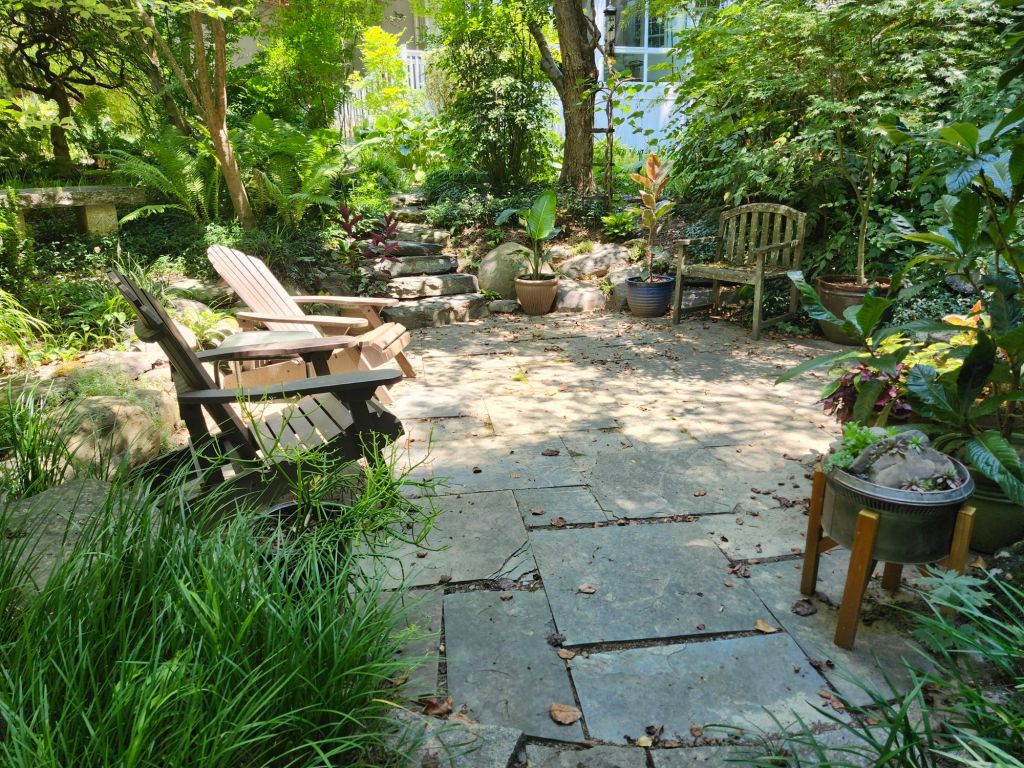 The sun has reached its midday peak, now shining unfiltered through the canopy of Japanese maples that surround the circular writing patio (below). While I typically move to a more shaded space, potted succulents and tropicals on the patio benefit from this brief moment of sunlight. Soon, the sun’s angle will change, and the patio will be shaded until evening when the slope of the garden allows the sun to shine under the canopy in the few minutes before it sets behind foothills of the Blue Ridge just to the west.