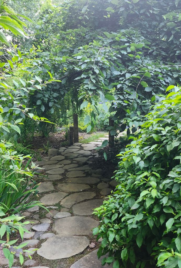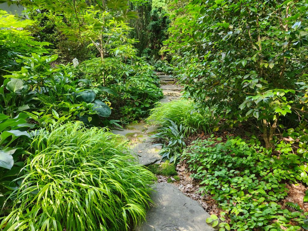 An area of deep shade beneath the canopy of the pendulous branched hornbeam (Carpinus betulus ‘Pendula’) continues to irritate me. I love the umbrella of foliage that obscures entry into the lower rear garden, but the few meager hostas will never satisfactorily fill the space. The shade is deep enough that I’m puzzled at the moment, trying to select something that will spread but isn’t too boring (though boring is better than nothing). Some day, it will hit me, hopefully soon.