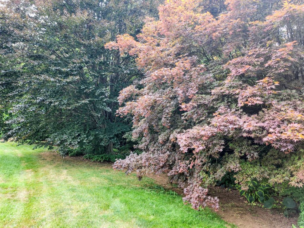 I hardly care a bit about the lawn (I’d happily be rid of it), and I can’t figure why I haven’t taken advantage to clear an area in the front garden beneath the huge purple leafed beech (Fagus sylvatica ‘Purpurea’), ‘Bloodgood’ Japanese maple (Acer palmatum ”Bloodgood’), and ‘Elizabeth’ magnolia (Magnolia ‘Elizabeth’). Competing with shallow roots and dense shade, the grass thinned down to almost bare dirt several years ago.